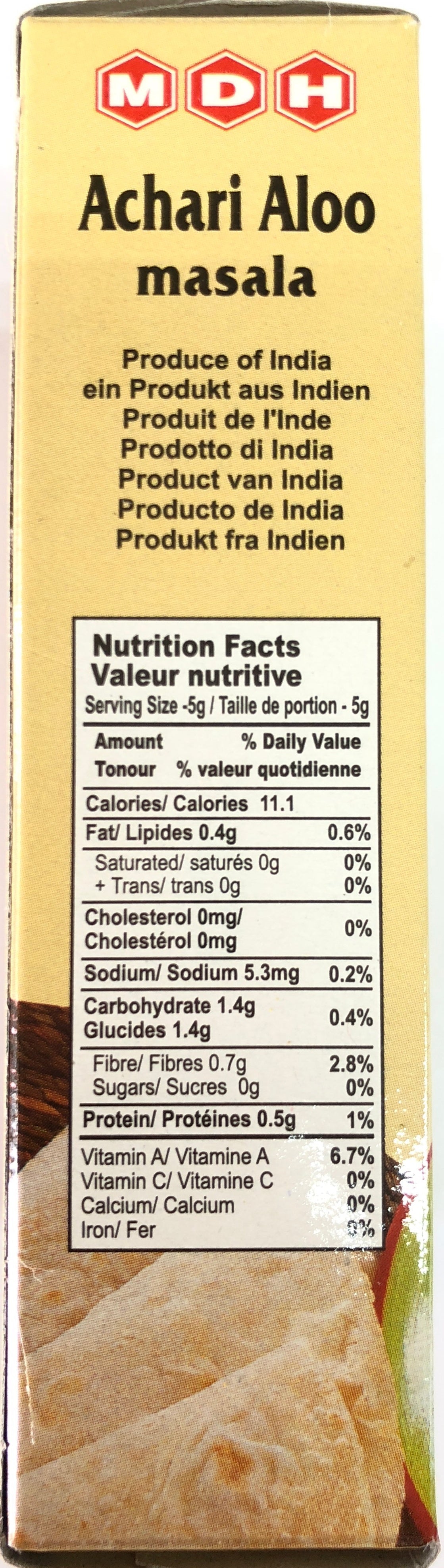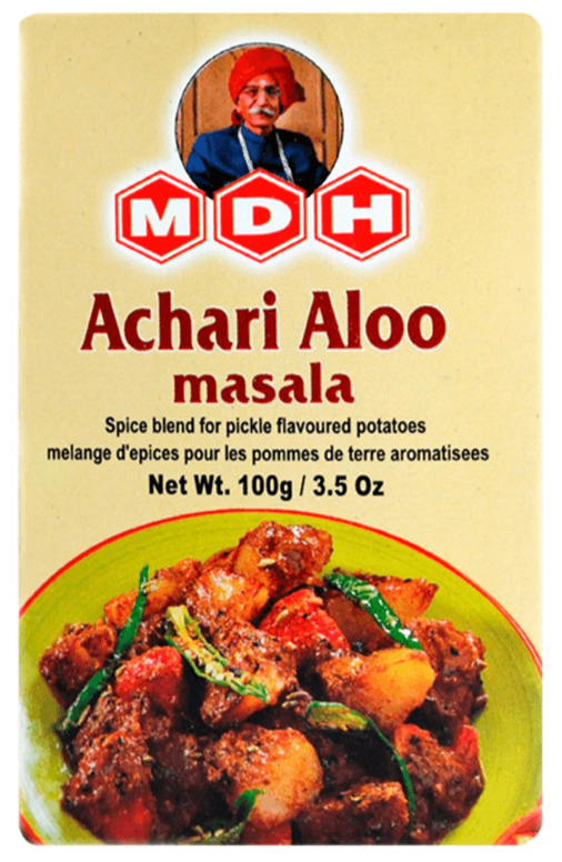 Achari Aloo Masala is a dry powder mix of spices and herbs, formulated to enable even a novice to cook a delicious dish of achar Aloo. Achari Aloo Masala may also be used to cook achari potetoes, a dish featuring South Asian pickle.