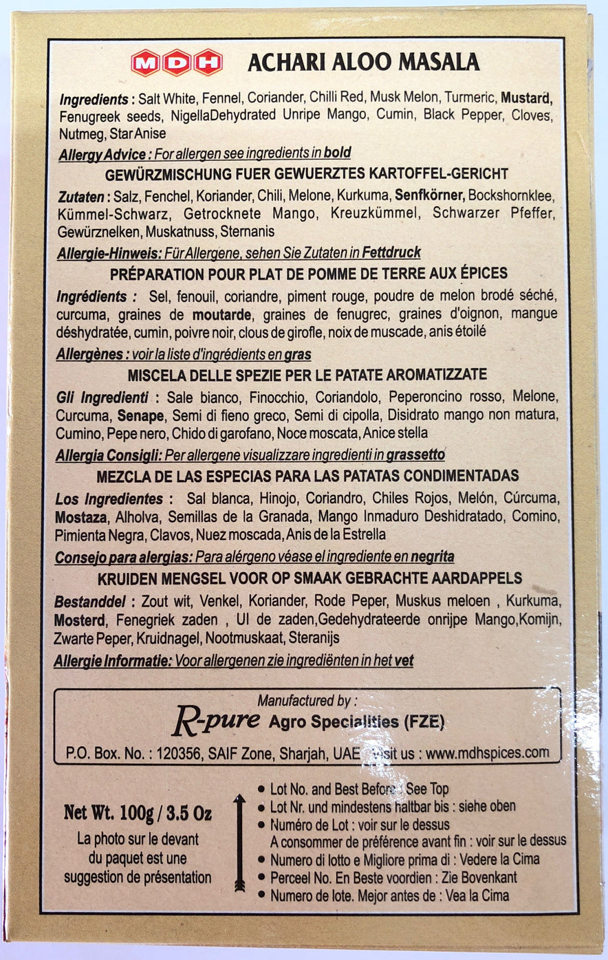 Achari Aloo Masala is a dry powder mix of spices and herbs, formulated to enable even a novice to cook a delicious dish of achar Aloo. Achari Aloo Masala may also be used to cook achari potetoes, a dish featuring South Asian pickle.