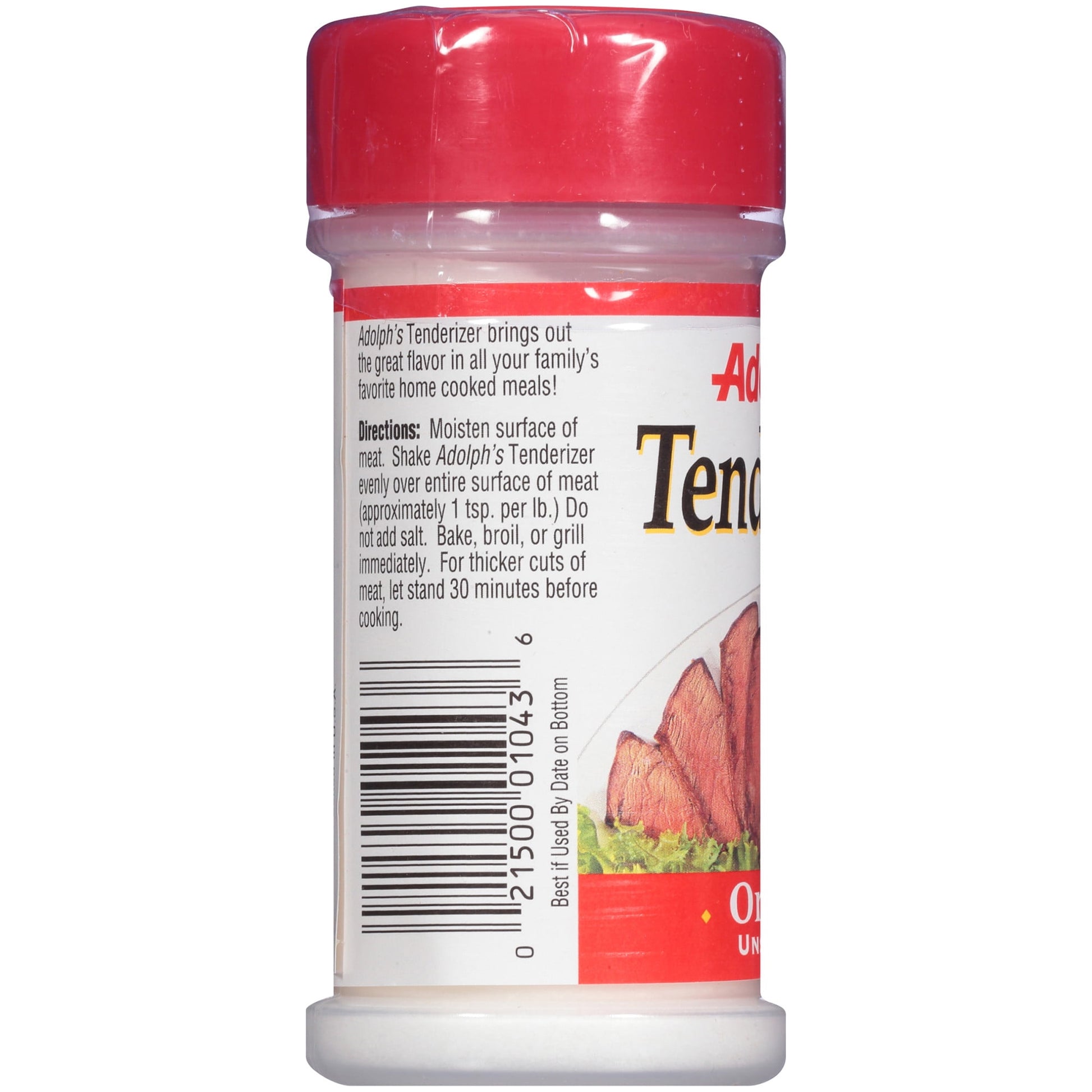 Adolph's Original Unseasoned Tenderizer, 3.5 oz is the perfect match for tough cuts of beef, pork and poultry. It tenderizes and brings out great flavor in your family’s home-cooked meals without any added MSG, artificial flavor, and colors from artificial sources. Take dinnertime to the next level with easy-to-use Adolph's Original Unseasoned Tenderizer, in a convenient shaker. Meats are gently tenderized with bromelain, an enzyme naturally found in pineapple. Simply moisten the surface of your choice of meat, shake on tenderizer (about 1 teaspoon per 1 pound of meat), and immediately bake, broil or grill to perfection. No need for salt or marinating time. Your beef, pork and poultry dinners will be tender and savory with our tenderizer – it’s the secret to mouthwatering meals infused with flavor. This Adolph's® Unseasoned Tenderizer is in a Plastic bottle that is 3.5 ounces. Store this shelf-stable item at an ambient temperature.