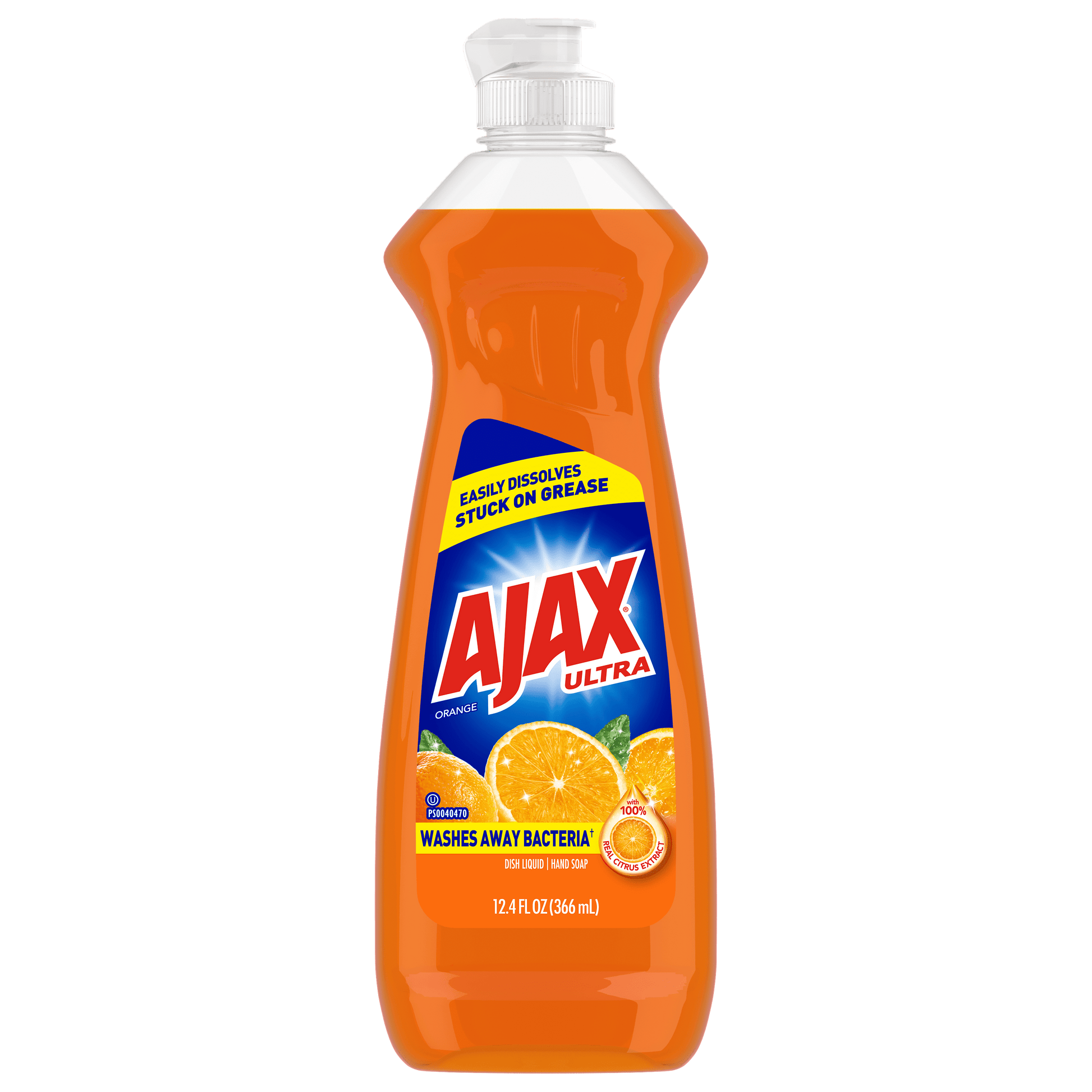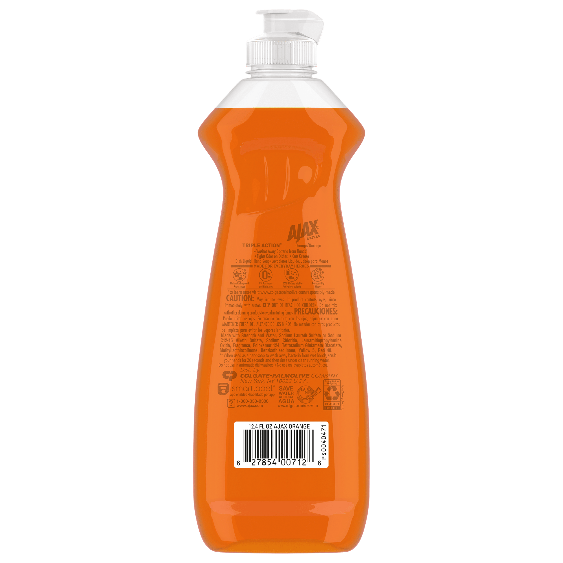 Ajax Triple Action Orange 12.4 Fluid Ounces Dish Liquid provides a pleasant and powerful cleaning experience with the lively scent of oranges while leaving your dishes sparkling clean. This product cuts grease to get dishes clean and spotless. This product also washes away bacteria on hands (when used as a hand soap, to wash away dirt and bacteria from hands, wash them for 2 seconds under clean running water) and fights odor on dishes. This dishwashing liquid is kosher and phosphate free.