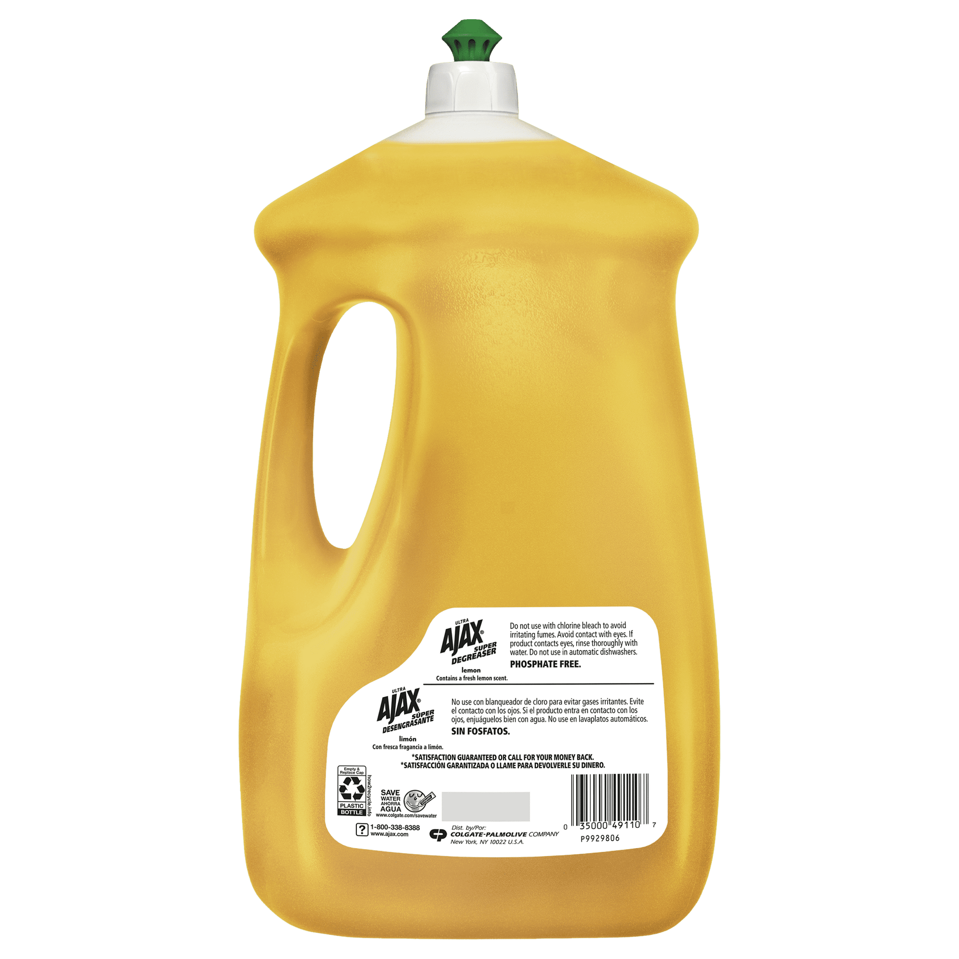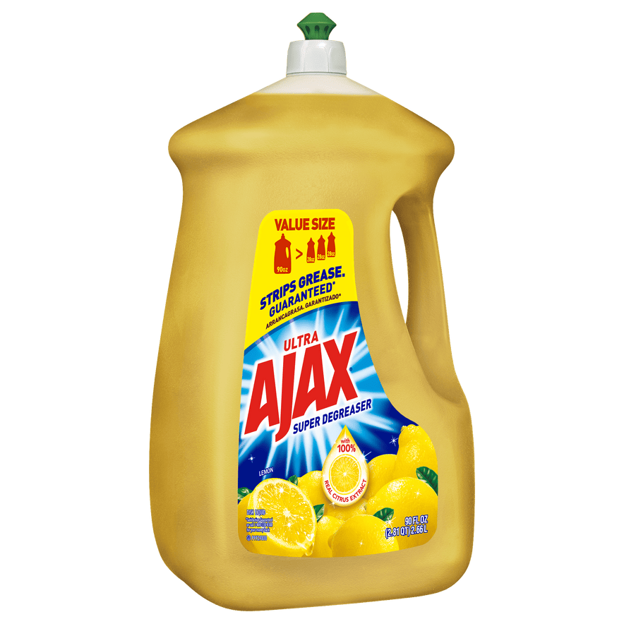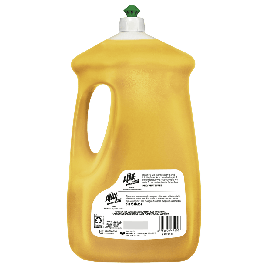 Delight in the fresh, clean aroma of lemon while getting your dishes spotlessly clean with Ajax Super Degreaser Lemon Dishwashing Liquid. It is formulated with natural citrus extracts and powerful ingredients. It removes tough, baked-on food residue, dirt, soil and grease. This dishwashing liquid is kosher and phosphate free.Purchase our dish soap dispenser bottles and refills in bulk to make sure you always have some on hand.