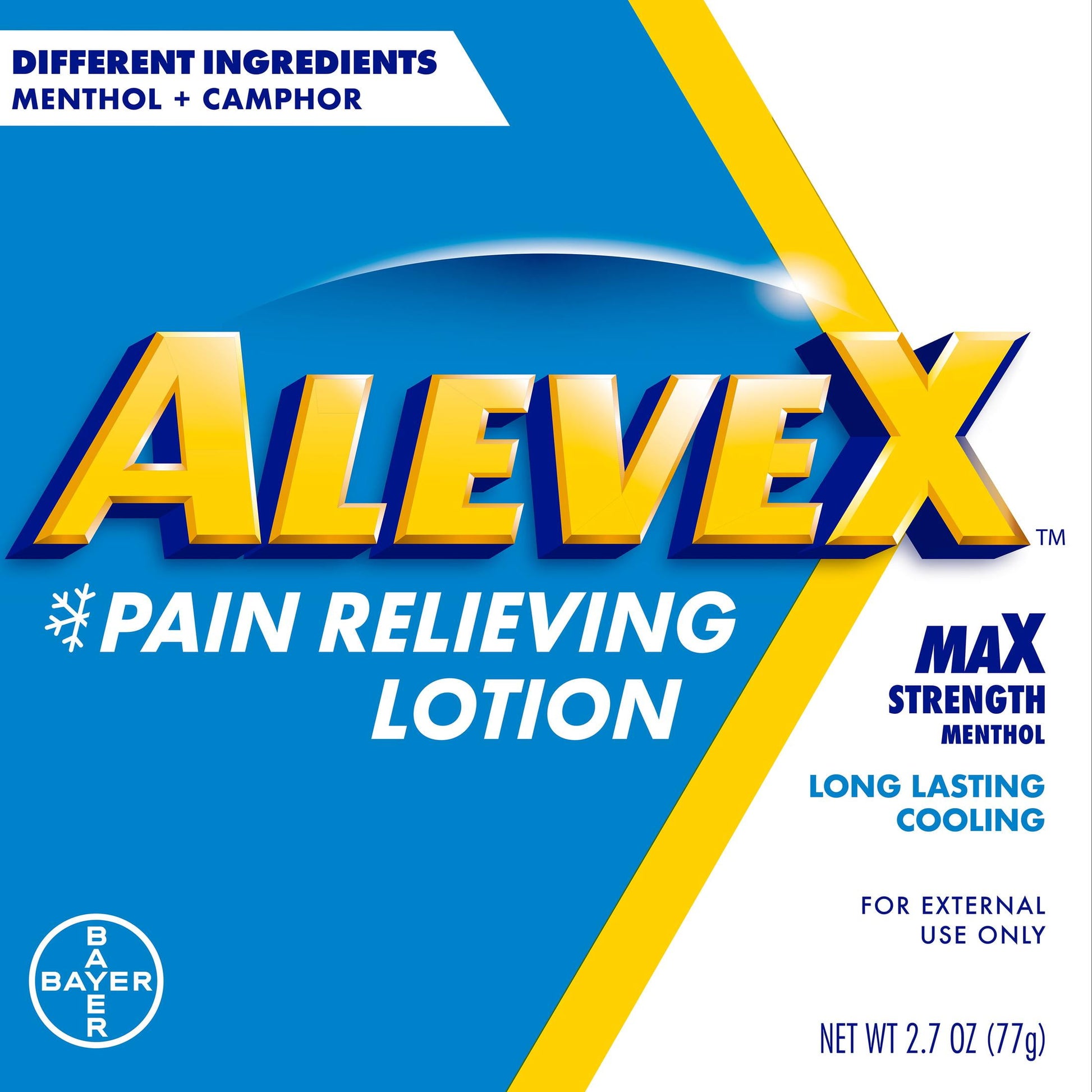 AleveX Pain Relieving Lotion is made with Camphor and maximum strength Menthol to provide targeted pain relief for pain due to minor arthritis, backache, strains, sprains, and bruises. Preferred two times more than the leading topical pain relief gel*, this muscle pain relief lotion provides long_x0002_lasting relief so you can get back to doing what you love without pain holding you back. A convenient alternative to pills, AleveX Pain Relieving Lotion provides a lightweight, cool-to-the-touch sensation to soothe minor aches and pains quickly. Simply apply to the indicated area for pain relief at the site of discomfort. Pain happens. Aleve it. Use as directed.*Based on Consumer Study