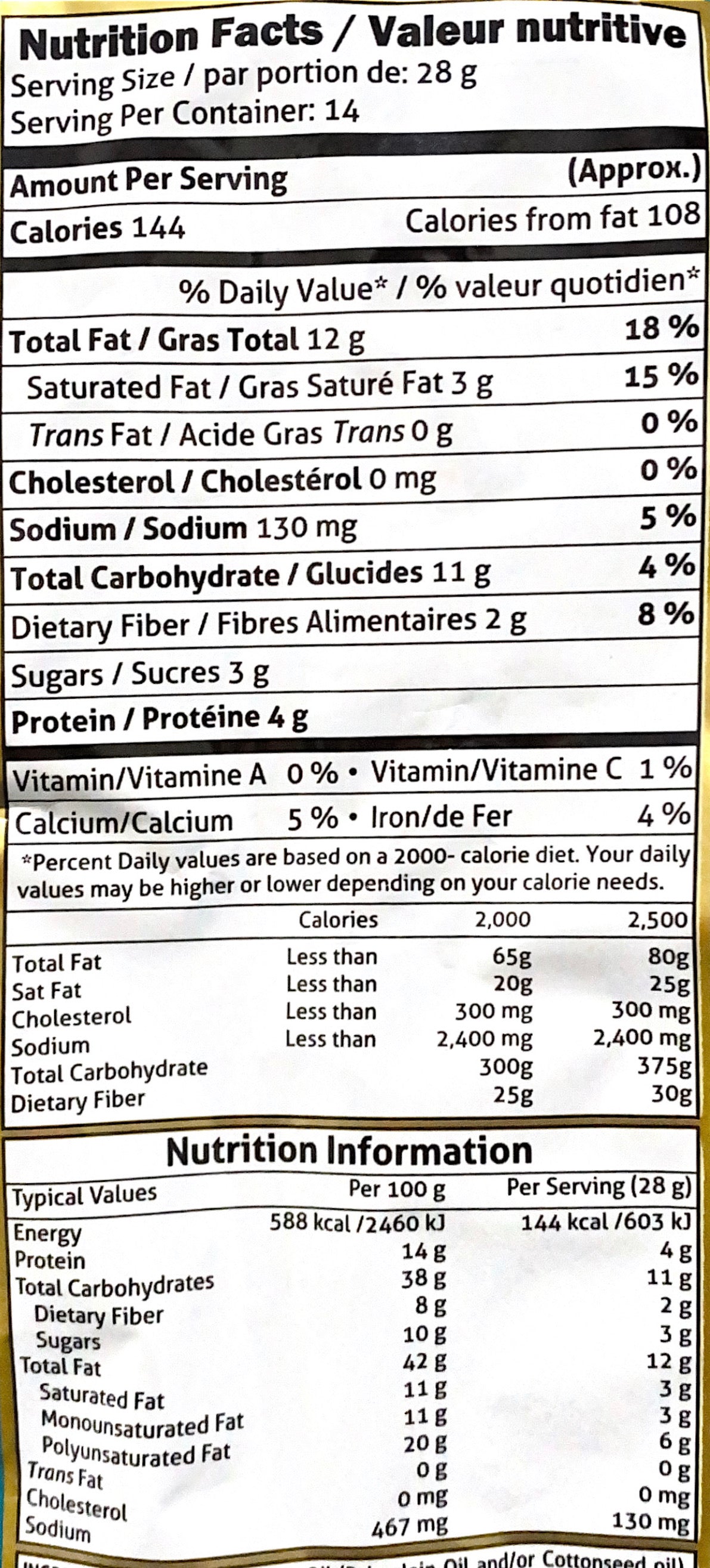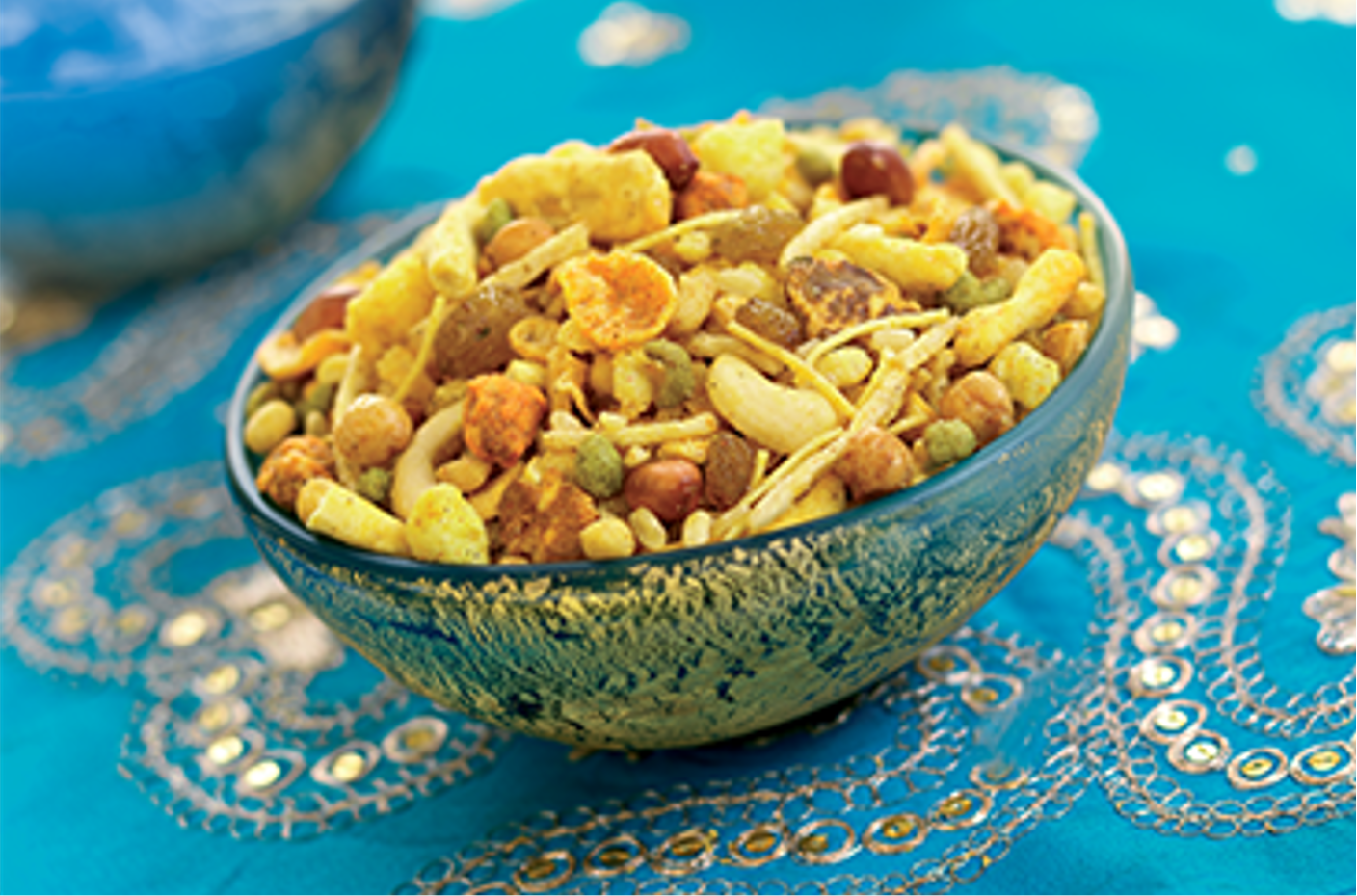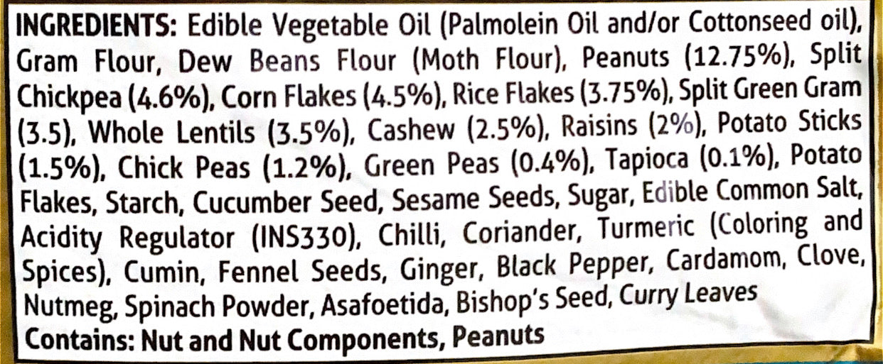 Edible Vegetable Oil (Palmolein oil and/or cottonseed oil), Gram Flour, Dew Beans Flour (Moth Flour), Peanuts (12.75%), Split Chickpea (4.6%), Corn Flakes (4.5%), Rice Flakes (3.75%), Split Green Gram (3.5), Whole Lentils (3.5%), Cashew (2.5%), Raisins (2%), Potato Sticks (1.5%), Chick Peas (Chana Press) (1.2%), Green Peas (0.4%), Tapioca (0.1%), Potato Flakes, Starch, Cucumber Seed, Sesame Seeds, Sugar, Edible Common Salt, Acidity Regulator (INS330), Chilli, Coriander, Turmeric (Coloring and Spices), Cumin, Fennel Seeds, Ginger, Black Pepper, Cardamom, Clove, Nutmeg, Spinach Powder, Asafoetida, Bishop’s Seed, Curry Leaves.