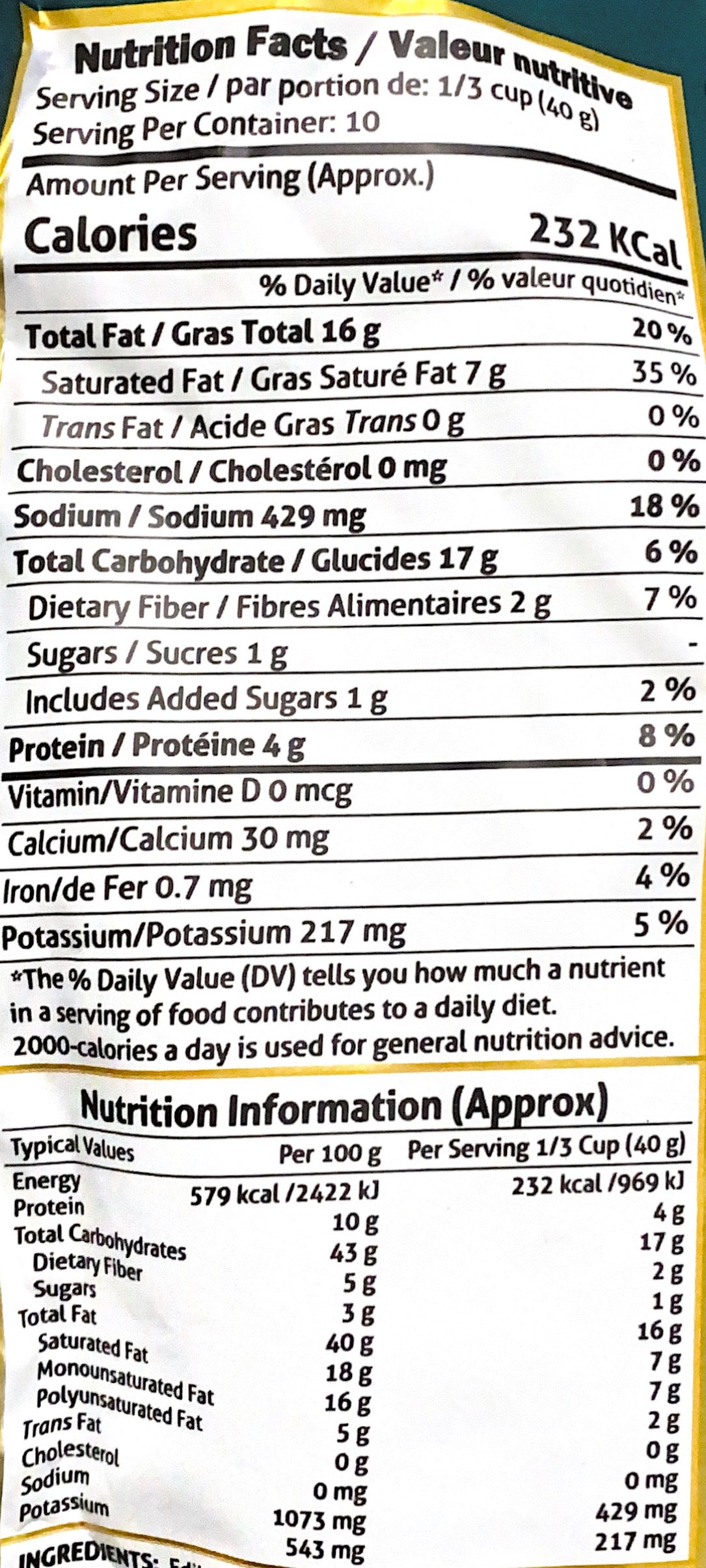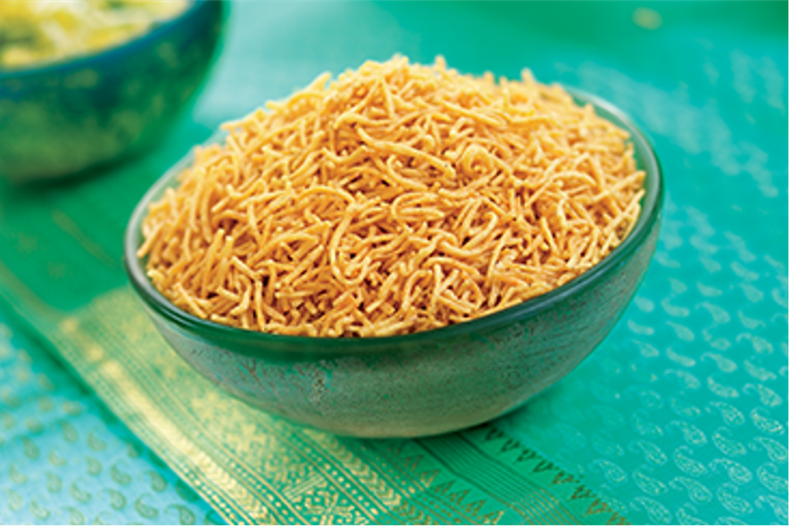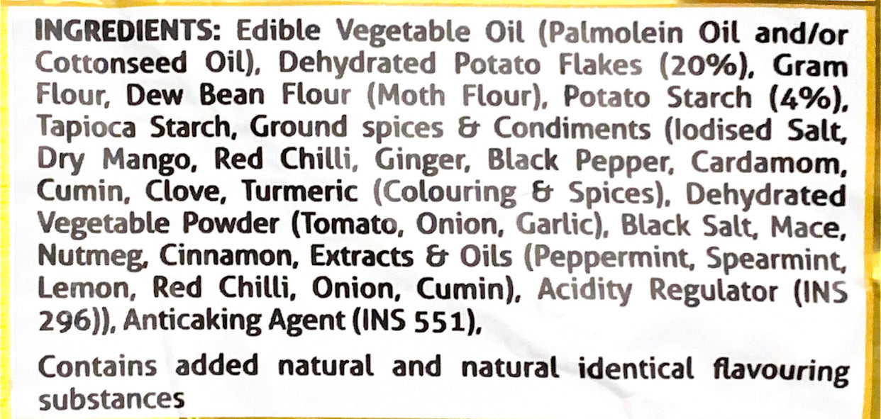 Edible Vegetable Oil (Palmolein Oil and/or Cottonseed Oil), Dehydrated Potato Flakes (20%), Gram Flour, Dew Bean Flour (Moth Flour), Potato Starch (4%), Tapioca Starch, Ground Spices & Condiments (Iodised Salt, Dry Mango, Red Chilli, Ginger, Black Pepper, Cardamom, Cumin, Clove, Turmeric (Colouring & Spices), Dehydrated Vegetable Powder (Tomato, Onion, Garlic), Black Salt, Mace, Nutmeg, Cinnamon, Extracts & Oils (Peppermint, Spearmint, Lemon, Red Chilli, Onion, Cumin), Acidity Regulator (INS 296)), Anticaking Agent (INS 551)