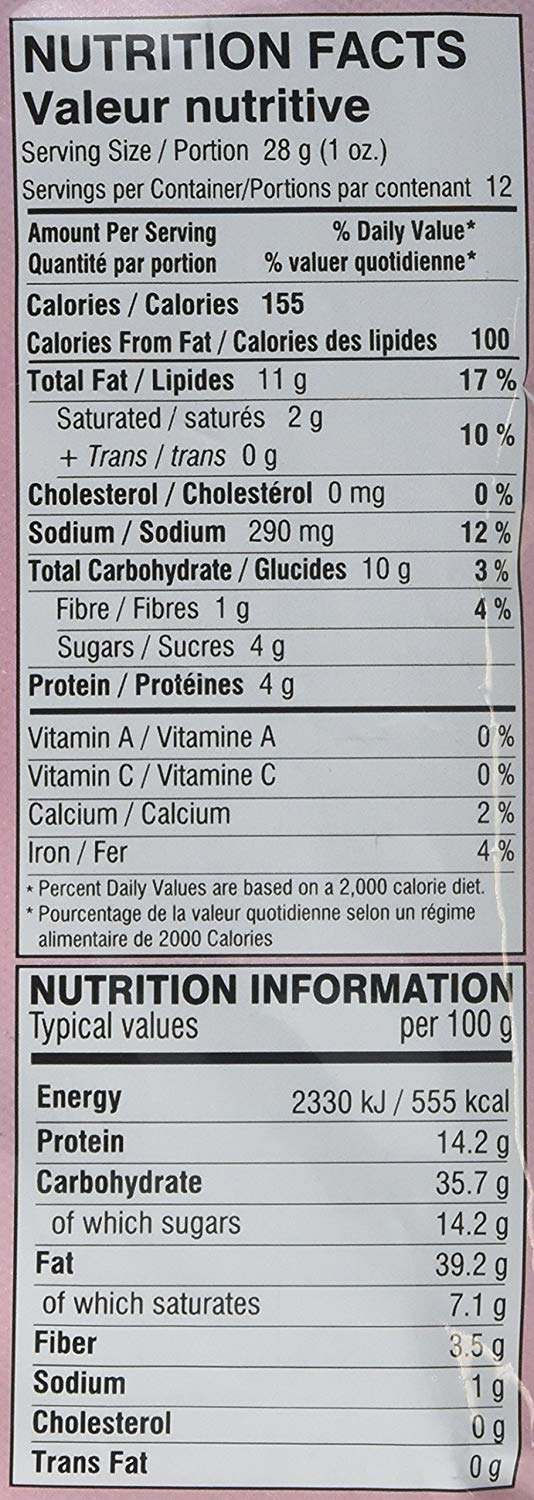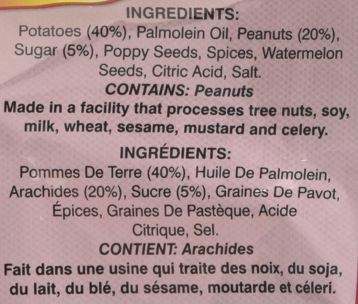 Ingredients: potatoes, palmolein oil, peanuts, sugar, poppy seeds, spices, watermelon seeds, citric acid, salt.