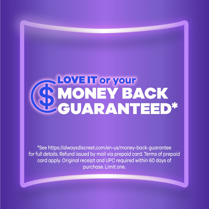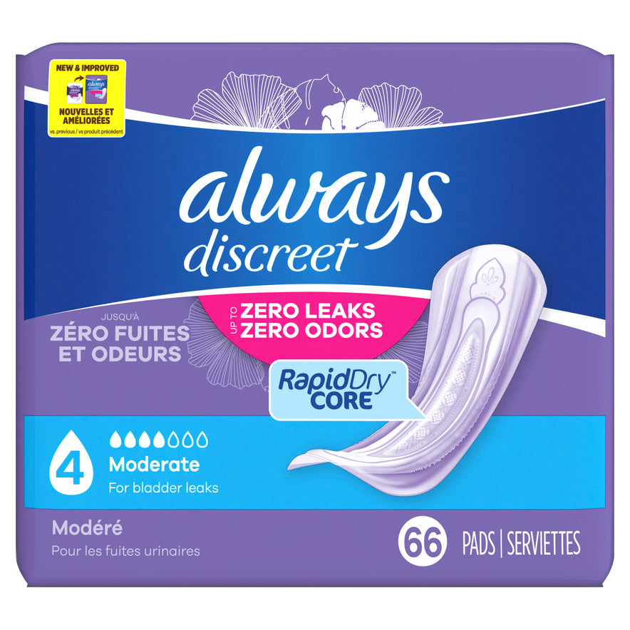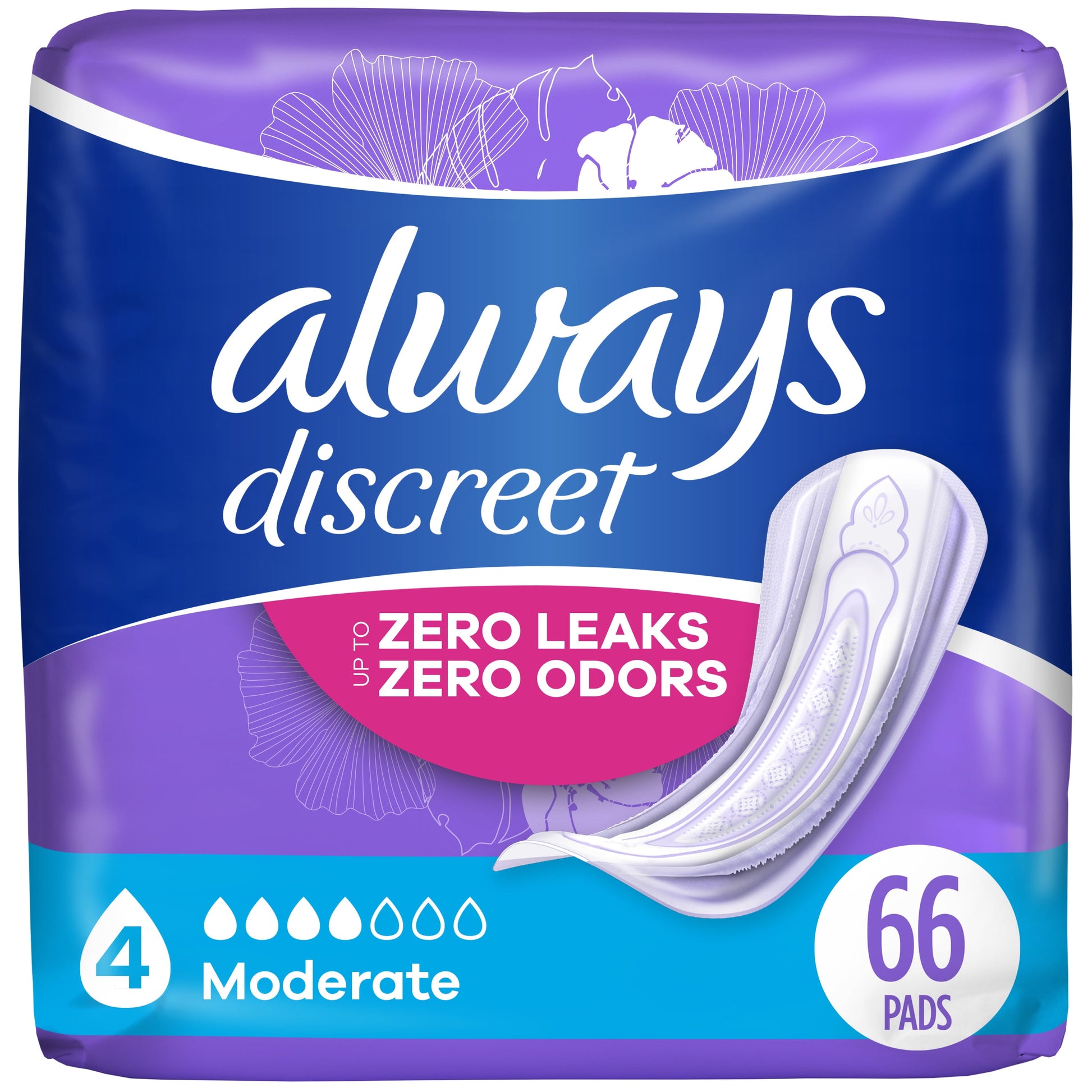 Looking for incredibly strong bladder leak protection that's barely noticeable under clothes? Experience incredible bladder leak and postpartum protection in a surprisingly thin and discreet incontinence pad. Always Discreet Incontinence Pads, Moderate Absorbency, Regular Length, 66 CT for women provide the comfort you need with up to the 100% leak-free protection you deserve. Thanks to a unique absorbent core that keeps your skin dry by absorbing bladder leaks in seconds, you'll be able to stay comfortable and feel fresh for hours. Walk with poise and confidence knowing two RapidDry layers form a boosted protection zone in the center of the pad that holds up to 5x the average leak, giving you extra bladder control protection where you need it most. The LeakGuards help keep wetness away from the sides and prevent run-offs at the edges where unexpected leaks tend to occur, while the lightly scented OdorLock technology neutralizes odors instantly and continuously. Don't let bladder leaks get in the way of your day. Simply find your right size with the Always Discreet My Fit chart and get the bladder control pads for women with protection you can depend on. Incontinence liners, bladder leak pads for women, maxipads, and pantiliners are FSA and HSA eligible. Always Discreet Incontinence Pads are available in bulk for added convenience.