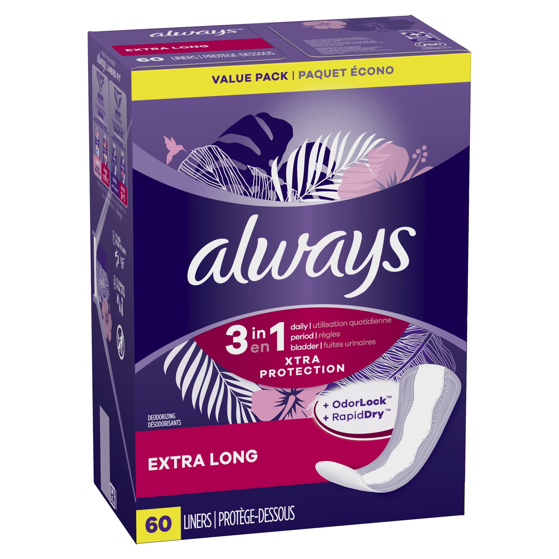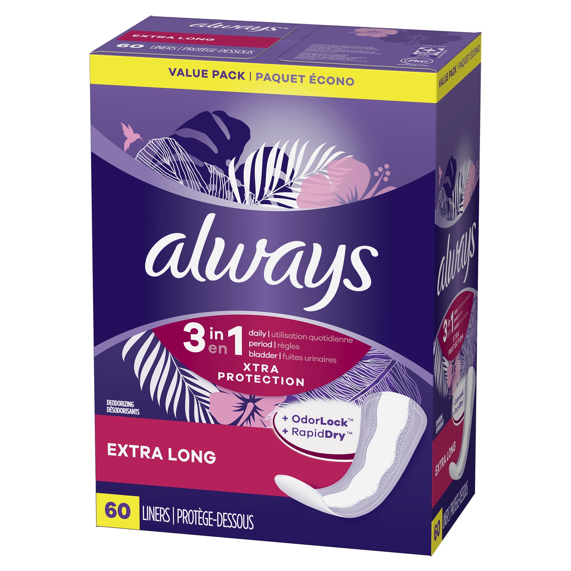 Looking for all-day freshness no matter how you move? Always Extra Protection 3-in-1 Daily Liners Extra Long help keep you dry from daily discharge, period leaks, and light incontinence for a fresh and clean feeling. These daily pantiliners absorb leaks in seconds, while the Leak Guards help keep wetness from the sides, so you can feel confident. Always 3-in-1 Daily Liners absorb 8X more to keep you protected for daily, period, and bladder (vs. Always Thin Daily Liners), and have Edge-2-Edge Adhesive helps keep the panty liner in place. Remember to use the Always Liners Fit sizing chart so you can find your best fit, since Always offers a wide range of liners to meet your needs. Always Feminine Products are now HSA/FSA-Eligible in the US. 60 Liners
