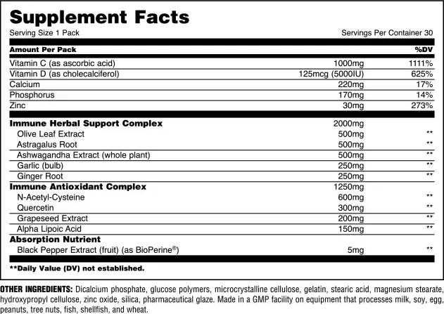 With Animal Immune Pak, you get plenty of everything you need. And a few extras. In every pack, you get a potent dose of vitamin C and vitamin D, plus the immune-support minerals calcium, phosphorus and zinc. Add to that the right amounts of natural immune support plant and herb ingredients and you get a Complete Immune Support Complex designed to boost your body’s first line of defense.