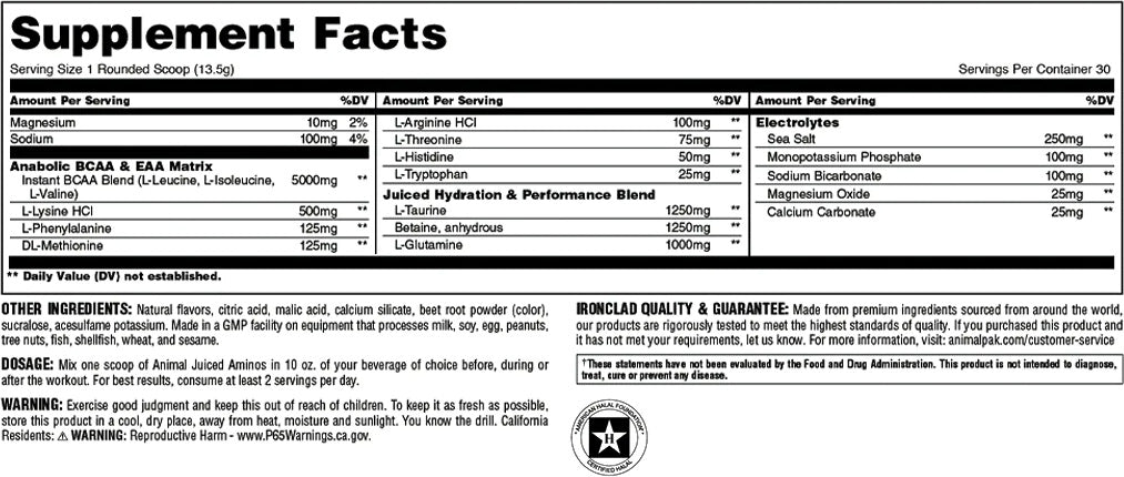 Our comprehensive formula also includes Improved hydration and endurance with the patented ingredients L-Glutamine, L-Taurine, and Citrulline Malate. Made for men and women who are looking to maximize their workout performance and recovery, Animal Juiced Aminos is so much more than a regular branched chain amino acid powder.