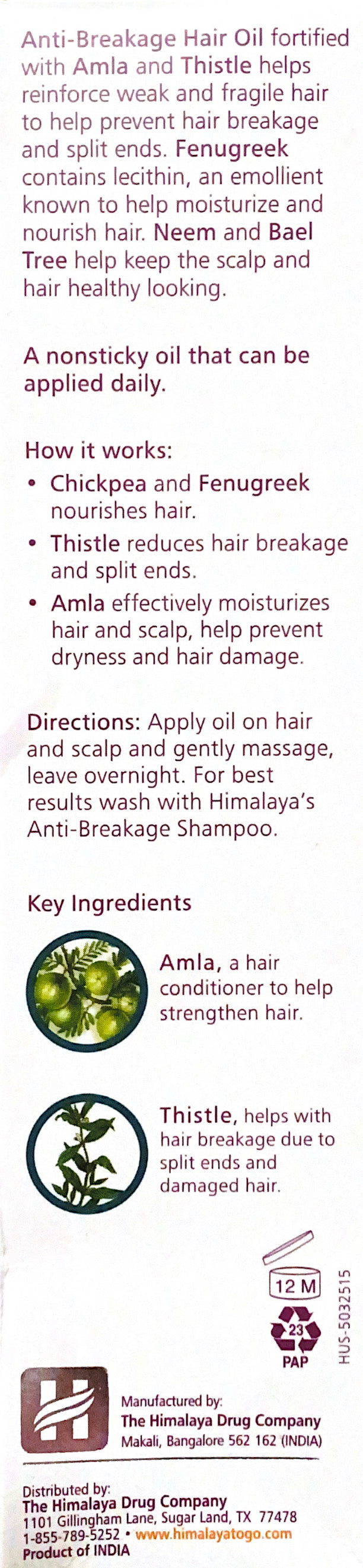 Dry, damaged hair and split ends won’t give you a break? Enough already. Snap out of it. Himalaya Anti-Breakage Hair Oil, a fortified combination of gentle moisturizers and herbal emollients will help nourish your scalp and condition your hair shaft to help prevent dryness and damage and leave your hair shiny and healthy looking. If you have dry or damaged hair, weak or fragile hair, this is the daily hair oil for you.