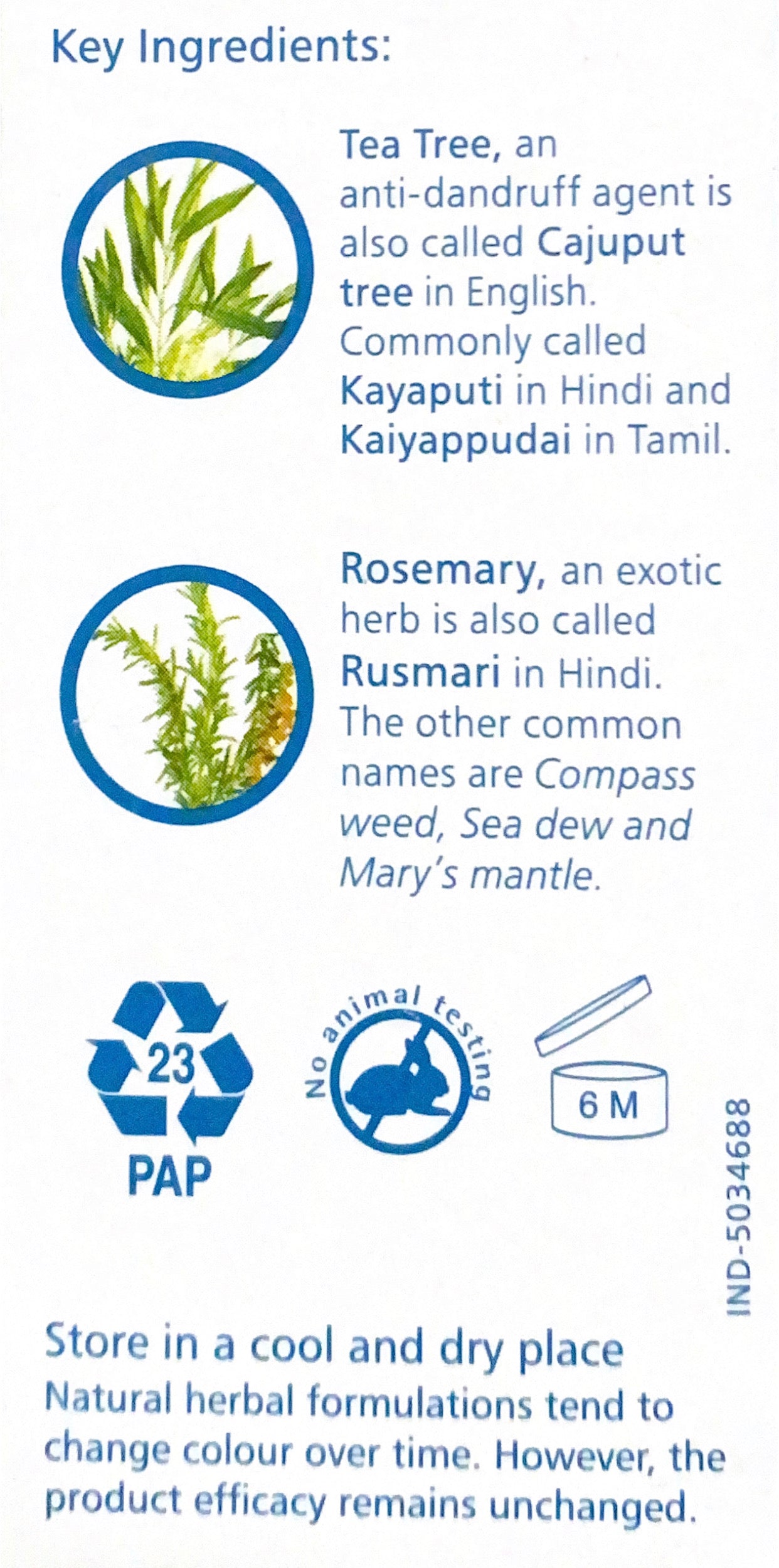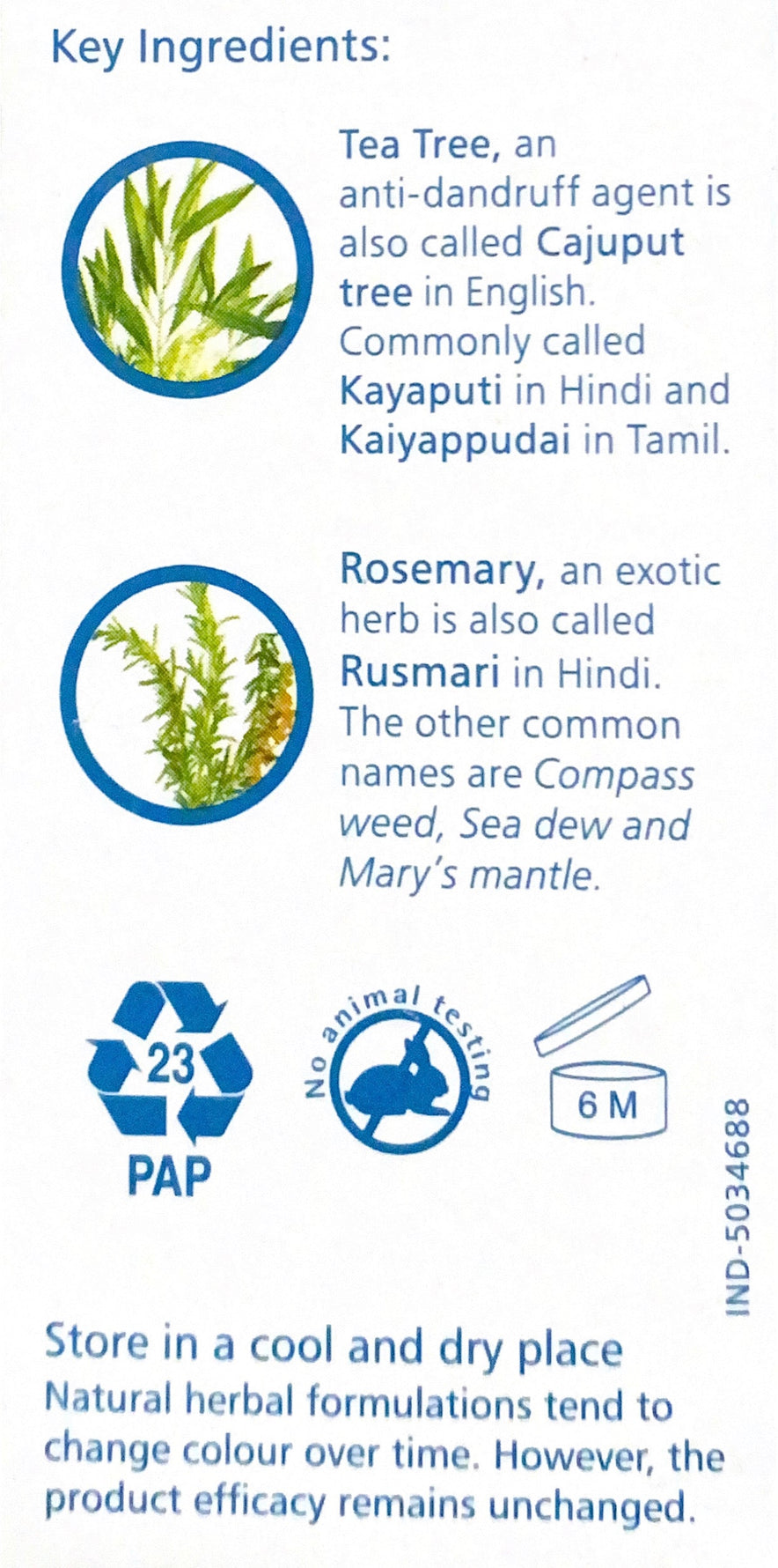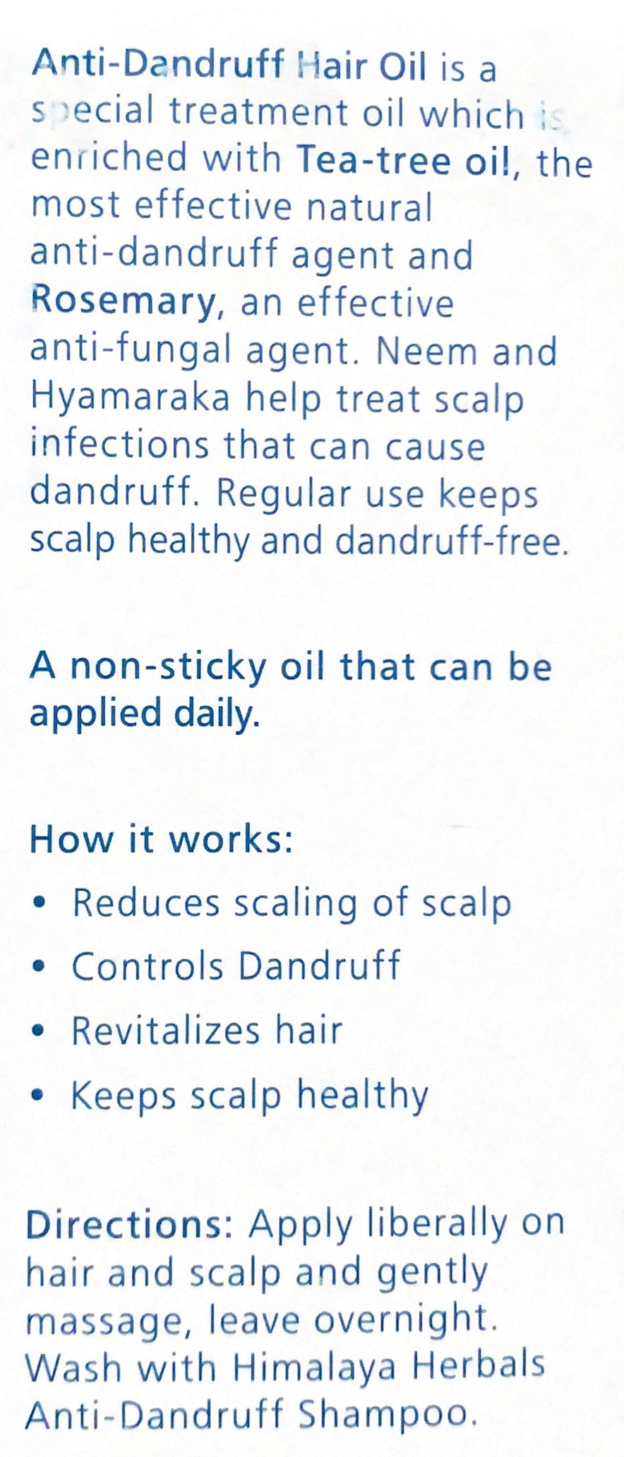 Anti-Dandruff Hair Oil: Love your healthy, dandruff-free hair. What it does: Himalaya's Anti-Dandruff Hair Oil prevents dandruff by eliminating microbial infections of the scalp. It nourishes the scalp and keeps hair healthy. Massaging hair with this nutrient-rich hair oil provides extra nutrition to the scalp and prevents hair fall. Massaging also increases blood circulation to the scalp, which strengthens hair roots. Regular scalp massages add luster and shine to hair. Tea tree oil has antimicrobial properties that fight scalp infections and relieve itching. It also acts as an antiseptic agent, which helps heal the scalp. The potent antibacterial properties of Snowflake Tree are perfect in treating dandruff. Key ingredients: Tea tree oil is a preferred ingredient in anti-dandruff treatments. Since bacteria is one of the main causes of dandruff, tea tree oil is effective as it has natural antibacterial, antiseptic and antifungal properties that fight dandruff. Tea tree oil helps strengthen the hair and protects it from scalp infections, making it a key ingredient in daily-use hair products. Snowflake tree, known for its white flowers that resemble gentle, soft flakes, has astringent and anti-inflammatory properties and is used as an antibacterial agent in the treatment of various scalp disorders. Rosemary is traditionally used in haircare treatments. Extracts of the plant are used to treat dandruff and other scalp infections. It is also used to prevent premature balding. Rosemary strengthens hair follicles, making hair grow longer and stronger. Neem, a tree native to India, is a vital ingredient in Ayurveda. Regarded as a 'one tree pharmacy', the Neem plant has several medicinal uses and forms an integral part of home remedies for the hair and skin. The neem leaf has antifungal and antibacterial properties, making it effective in treating dandruff. It also relieves dryness and itching, strengthens hair and promotes hair growth. Traditionally, Neem paste has been used to condition the hair and scalp as it soothes irritation and prevents dryness and flaking.