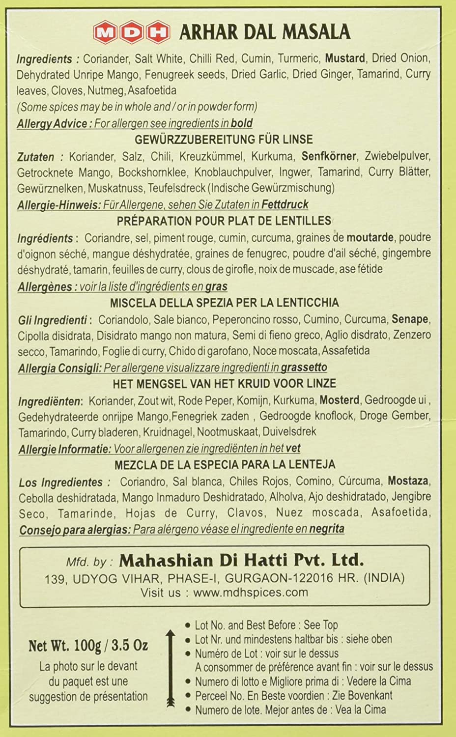 MDH Arhar Dal Masala is a spice blend for lentils. It is Made with coriander, red chilli, curry leaves, dry ginger and other Savory ingredients.