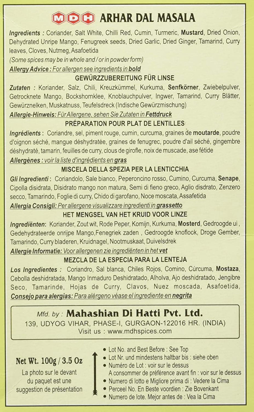MDH Arhar Dal Masala is a spice blend for lentils. It is Made with coriander, red chilli, curry leaves, dry ginger and other Savory ingredients.