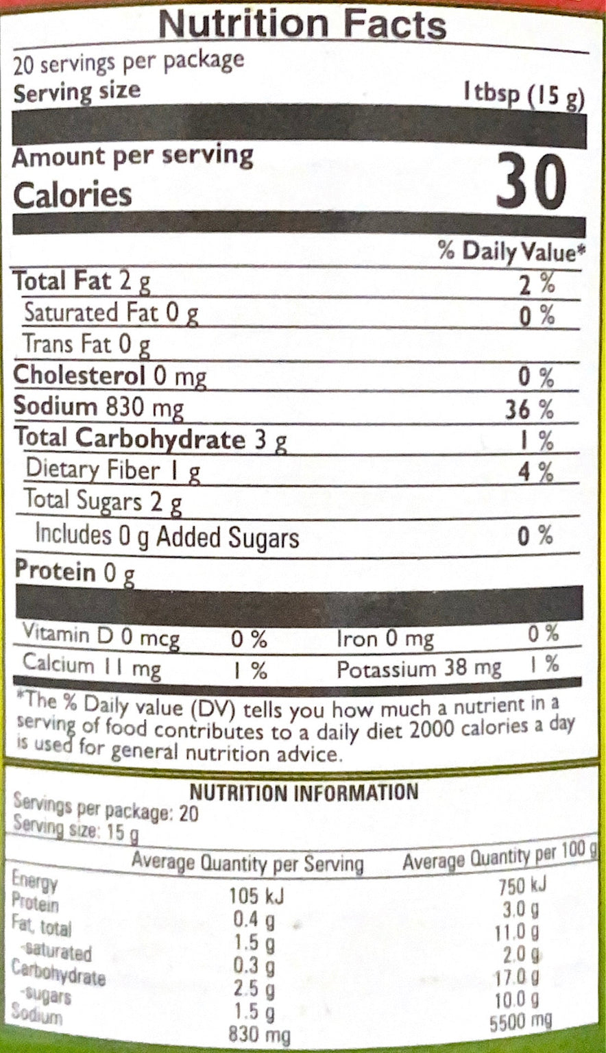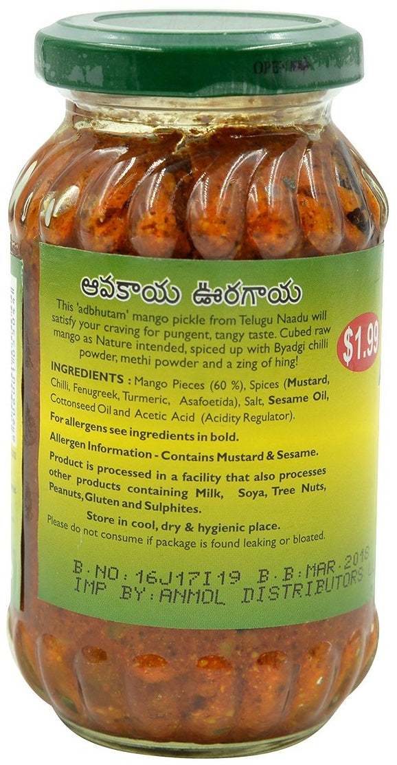 Ingredients: Mango Pieces (60%), Spices (Mustard, Chilli, Fenugreek, Turmeric, Asafoetida), Salt, Sesame Oil, Cottonseed Oil and Acidity Regulator (Acetic Acid).