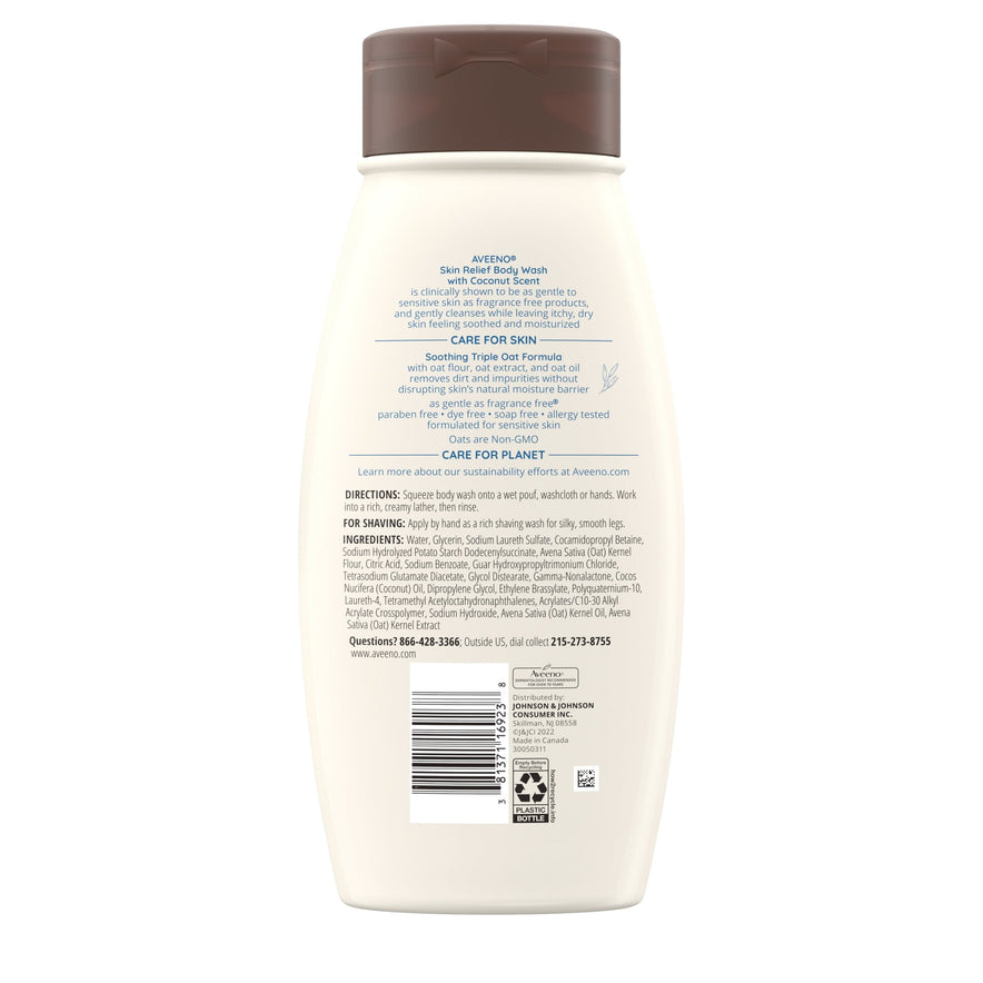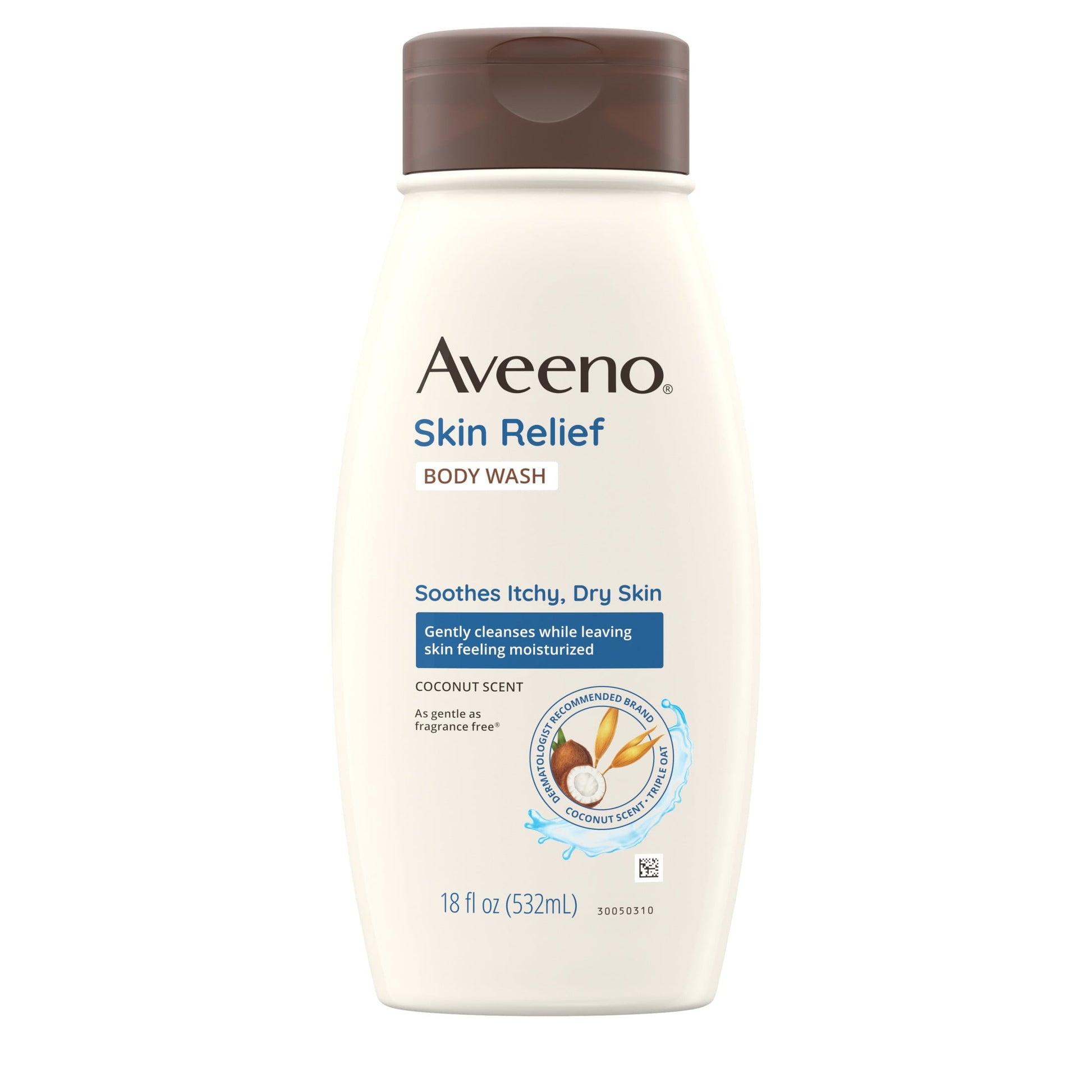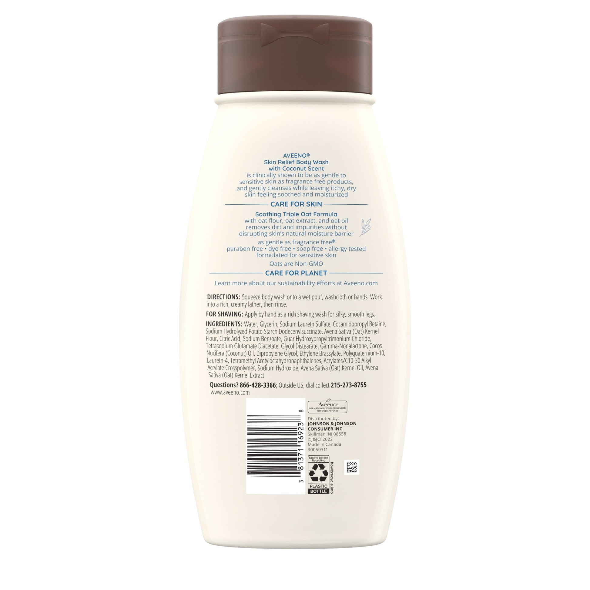 Gently cleanse while leaving itchy, dry skin feeling moisturized with Aveeno Skin Relief Body Wash with a gentle coconut scent. This sulfate free body wash is made with a soothing Triple Oat formula and formulated for sensitive skin. Aveeno Skin Relief Body Wash gently, but effectively cleanses with a gentle coconut scent while leaving itchy, dry skin feeling soothed and feeling moisturized. From the dermatologist-recommended brand for over 70 years, this coconut scented body wash is allergy-tested, free of sulfates, parabens, dyes, and soaps, and is suitable for daily use. To use, squeeze body wash onto a wet pouf, washcloth, or hands. Work into a rich, creamy lather, then rinse. Use the creamy body wash as a rich shave gel for silky, smooth legs. Follow with Aveeno Skin Relief Moisturizing Lotion to lock in moisture for 24 hours as a part of your daily skincare routine.