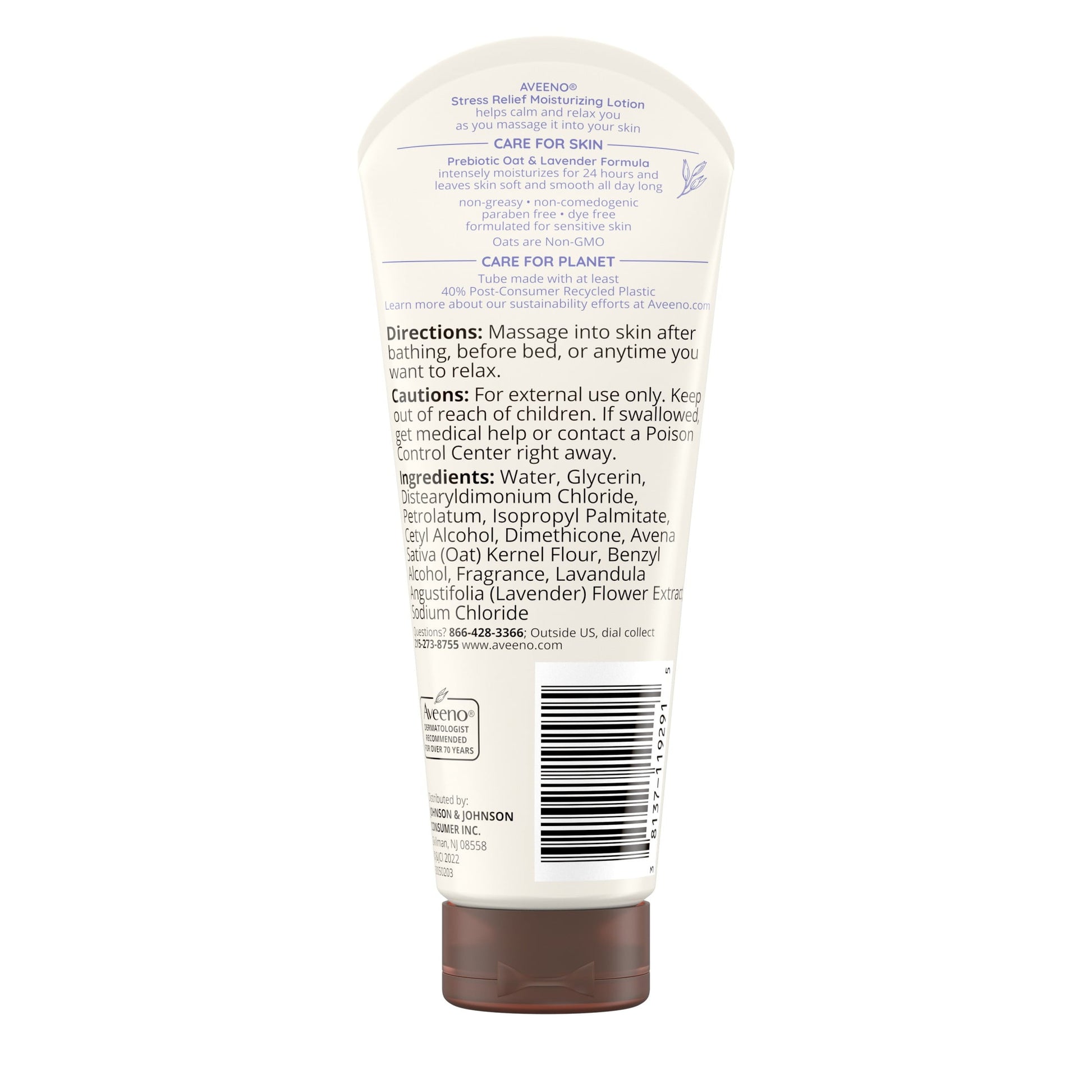 Aveeno Stress Relief Moisturizing Lotion helps calm and relax you while moisturizing for a full 24 hours to leave skin soft and smooth. Using the goodness of nature and the power of science, this soothing body lotion is made with prebiotic oat and intensely hydrates skin, leaving it feeling soft and smooth. It also uses the calming scent of lavender to help relieve stress as you massage it into your skin. The TSA-approved, travel-size tube is small enough to slip into a purse and carry anywhere to help relieve stress and moisturize anytime you want. This nourishing non-greasy formula absorbs quickly for lasting moisture throughout the day and is from a dermatologist recommended brand for over 70 years. Formulated for sensitive skin, this stress relief lotion is non-comedogenic, paraben free, dye free, and gentle. This tube is made with 40% Post-Consumer Recycled Plastic.