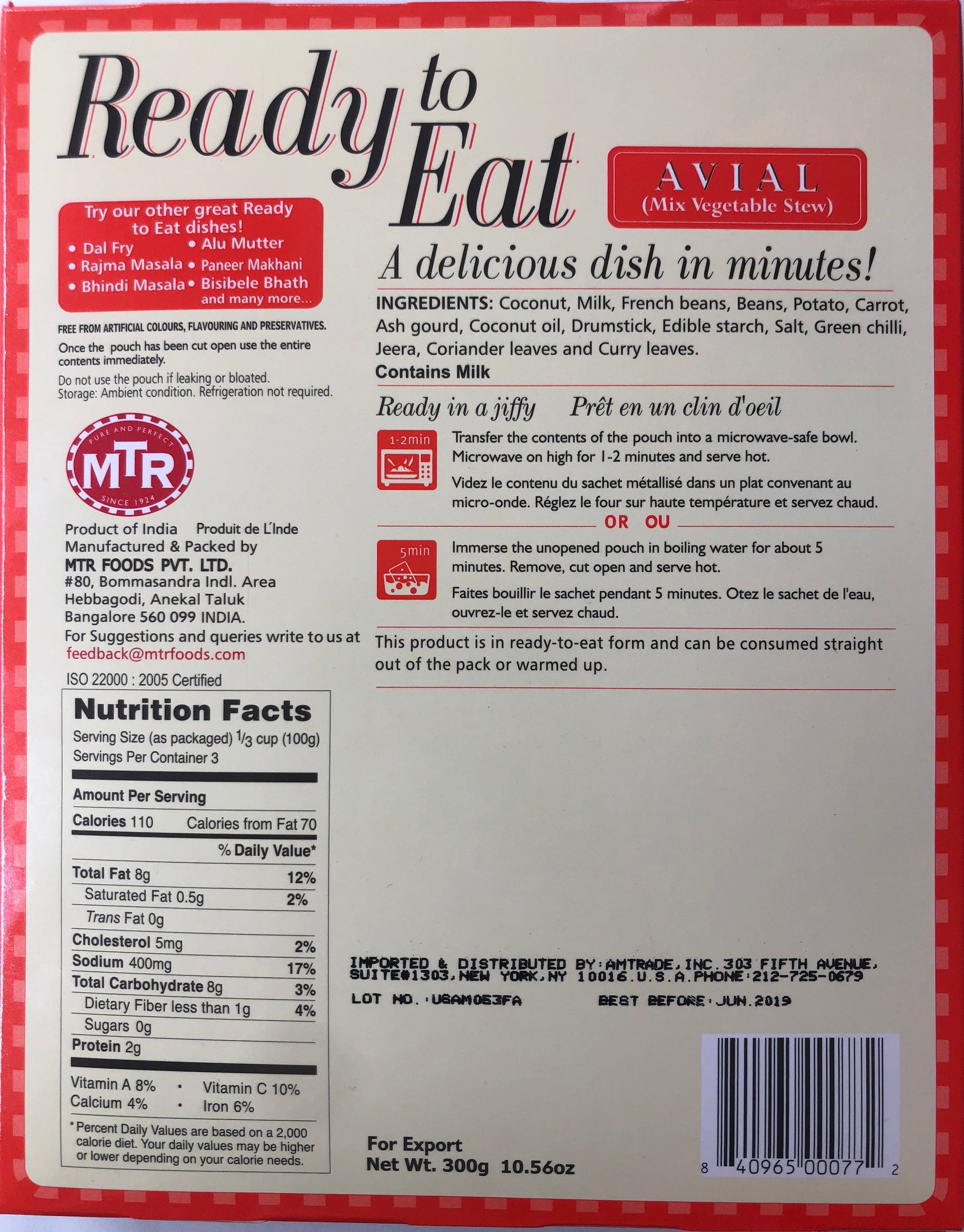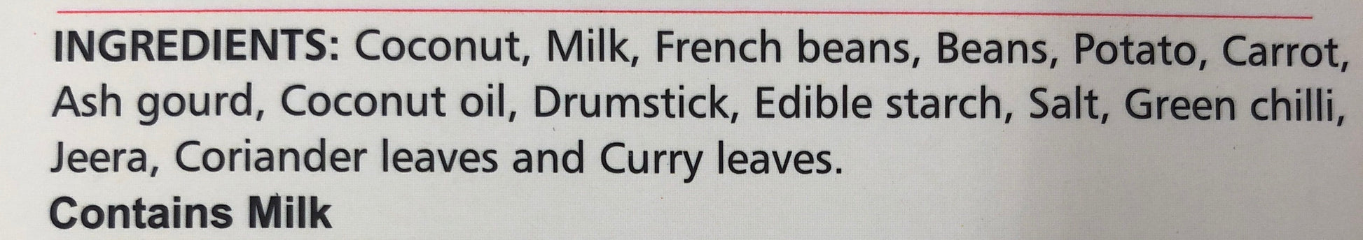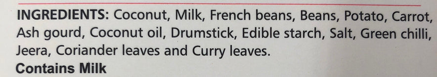Mixed regelables cooked in a hearty coconut sauce a traditional delight from kerala. (Mixed vegetables in coconut milk). Free from artificial colours, flavouring and preservatives. Once the pouch has been cut open use the entire contents immediately. Do not use the pouch if leaking or bloated.