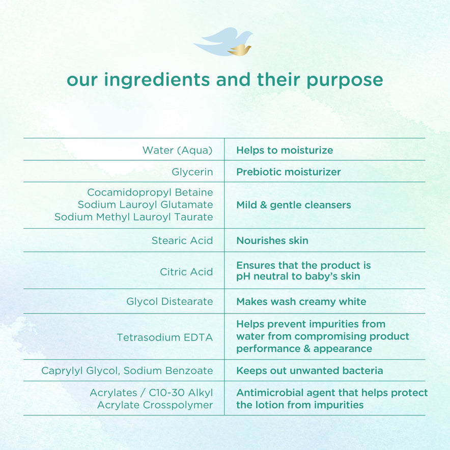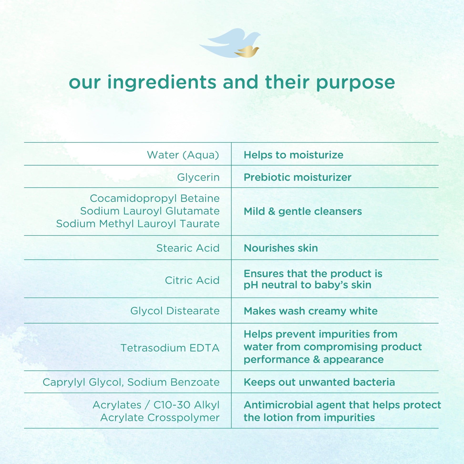 Baby Dove Sensitive Moisture Tip to Toe Unisex Body Wash, made with a pH-neutral formula, helps to replenish the essential moisture and nutrients that your baby's skin loses during bathing. Baby Dove Sensitive Moisture Tip to Toe Wash for sensitive skin keeps baby's skin looking healthy and moisturized, so you can give their delicate skin the care it needs to keep healthy and hydrated. Only Baby Dove adds back what other mild baby cleansers remove. Ophthalmologist, dermatologist and pediatrician-tested, with Baby Dove you know you're looking after your baby's delicate skin. Hypoallergenic and fragrance-free, the creamy lather of this baby wash for sensitive skin gently cleanses skin while helping it to retain its natural moisture. For skin that soft and clean, a tear-free bath awaits.