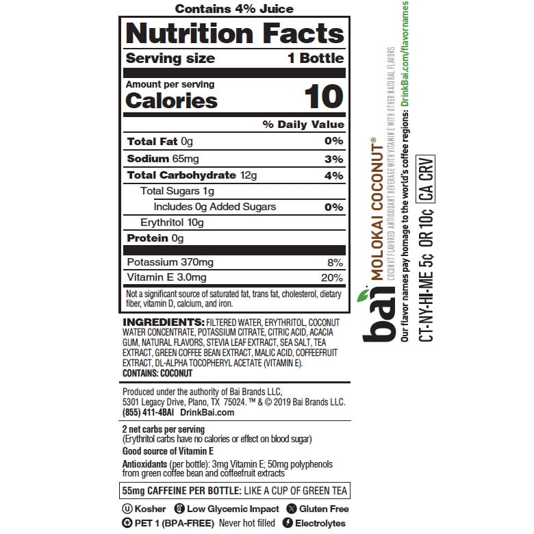 Everyone loves coconut. We took a poll, and it was unanimously pro-coco. Just like our other Bai flavors, our Cocofusions have 1 gram of sugar, no artificial sweeteners, and are infused with antioxidant goodness. At Bai, we’ve reimagined and expanded water’s superpowers beyond basic hydration. Bai® beverages are antioxidant, plant-powered infusions that deliver more than you ever expected from regular H2O. We wondered what water could truly become, and then we made it. Bai, It’s WonderWater™. Bai Antioxidant Infusions are flavored water beverages that deliver delicious fruity refreshment with 10 calories and 1 gram of sugar per bottle. With no artificial flavors or sweeteners, Molokai Coconut Bai is exotic-flavored, infused with tea extract for plant-based caffeine, gluten free, and low glycemic impact. Bai Antioxidant Infusions deliver refreshing, bold fruit flavor for those seeking better alternatives to beverages with high sugar and calories. Everyone at Bai® is committed to bringing this world to life. It’s a future too marvelous to exist only in our imaginations. We want everyone to be able to experience it. Bai’s approach to innovation guides us in our quest. We are eager to find new ways to translate modern wellness trends into tasty drinks everyone can enjoy. Because that’s the only way to make this world of better beverages a reality. And with every sip you take, we all are one step closer to our envisioned future.