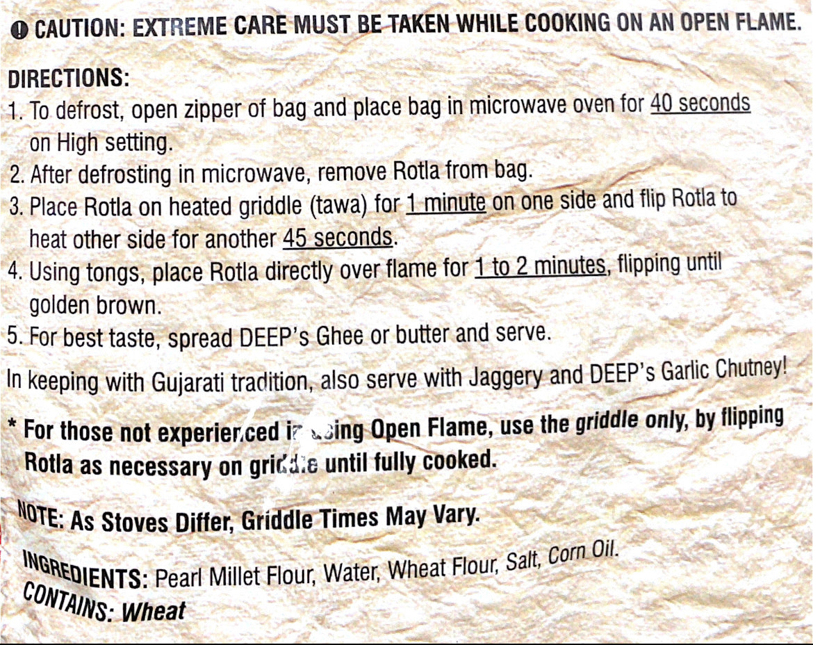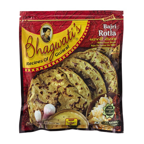 Bhagwati's Bajri Rotla is a plain and simple flat bread made from pearl millet flour. Bajri Rotla is an all time winter favorite food. The millet flour is rich in proteins, and is also a source of iron, calcium and other minerals like potassium, magnesium and zinc. Enjoy this Bajri Rotla with jaggery, bengan bharta, aloo methi, urad dal or kadhi.