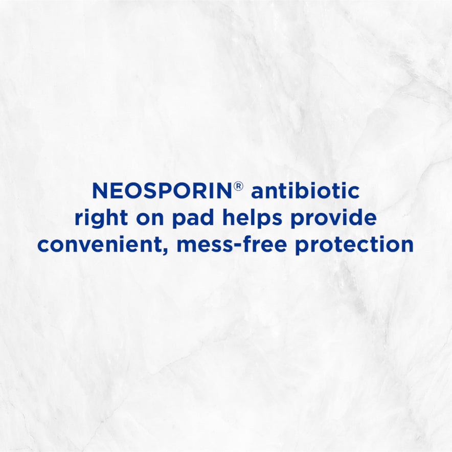 Get mess-free infection protection with these extra large Band-Aid Brand Adhesive Bandages Infection Defense with Neosporin. These sterile bandages have Neosporin antibiotic ointment right on the pad, and provide a 4-sided seal that protects against dirt & germs that may cause infection & delay healing. These Band-Aid Brand Adhesive Bandages also have a Hurt-Free Pad that won't stick to the wound, allowing for gentle removal. This package contains 8 extra large antibiotic bandages.