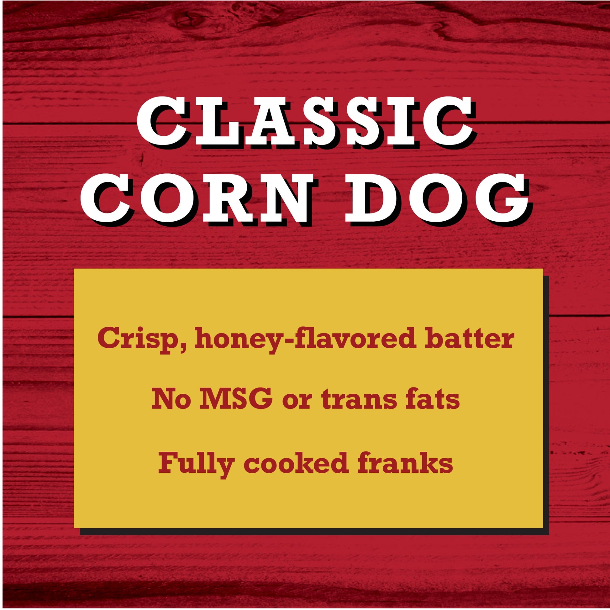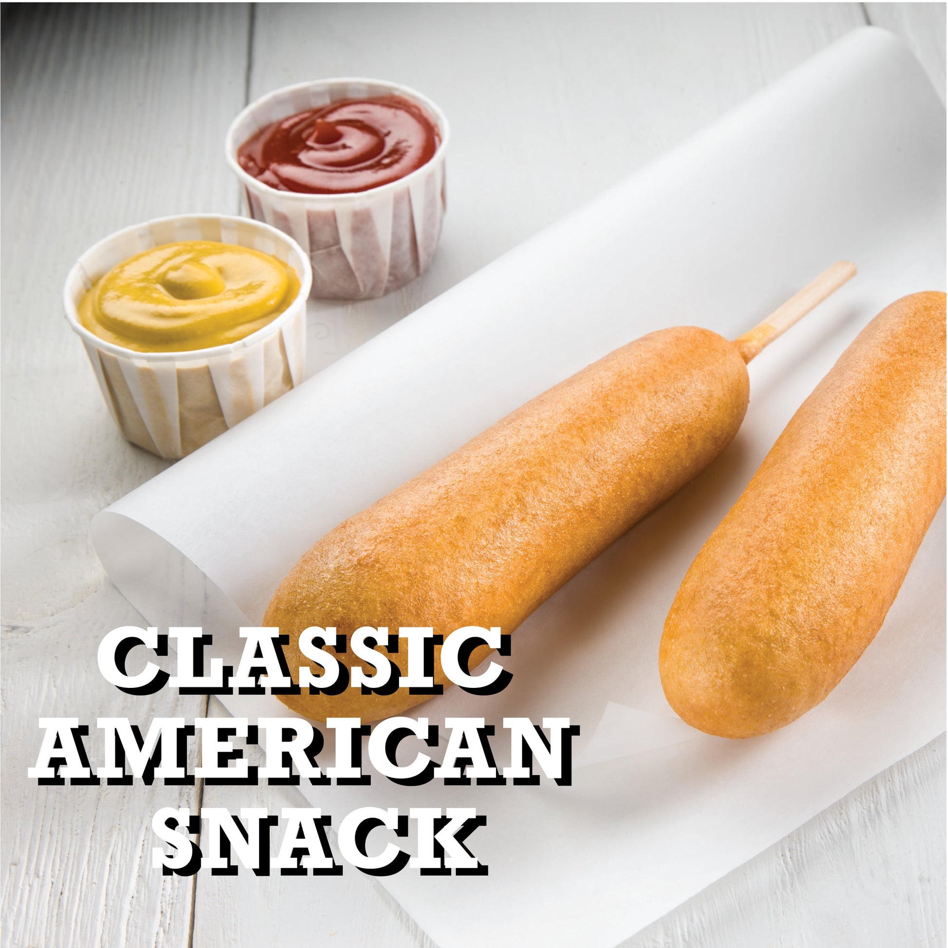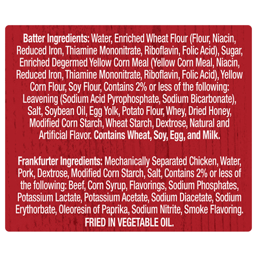 Bar-S Classic Honey Dipped Chicken and Pork Corn Dogs are made with our traditional, tasty Bar-S Franks, which have been America?s #1-selling frank for over 15 years! Each frank is dipped in a sweet, honey-flavored batter that is moist on the inside and crisp on the outside. Bar-S Classic Corn Dogs are fully cooked, then flash frozen to retain freshness. These corn dogs are vacuum-packed to prevent freezer burn and won't crack nor become soggy when microwaved.Whether it's part of a fun quick snack for the kids, a family dinner, or a late night craving, let our Corn Dogs help you and your family savor every moment. Each corn dog has 5g of protein and zero grams of trans fat.