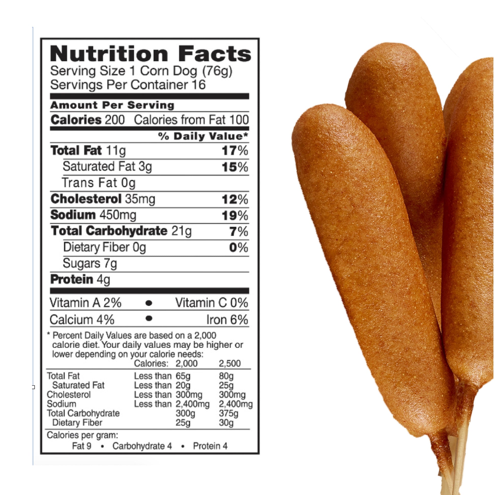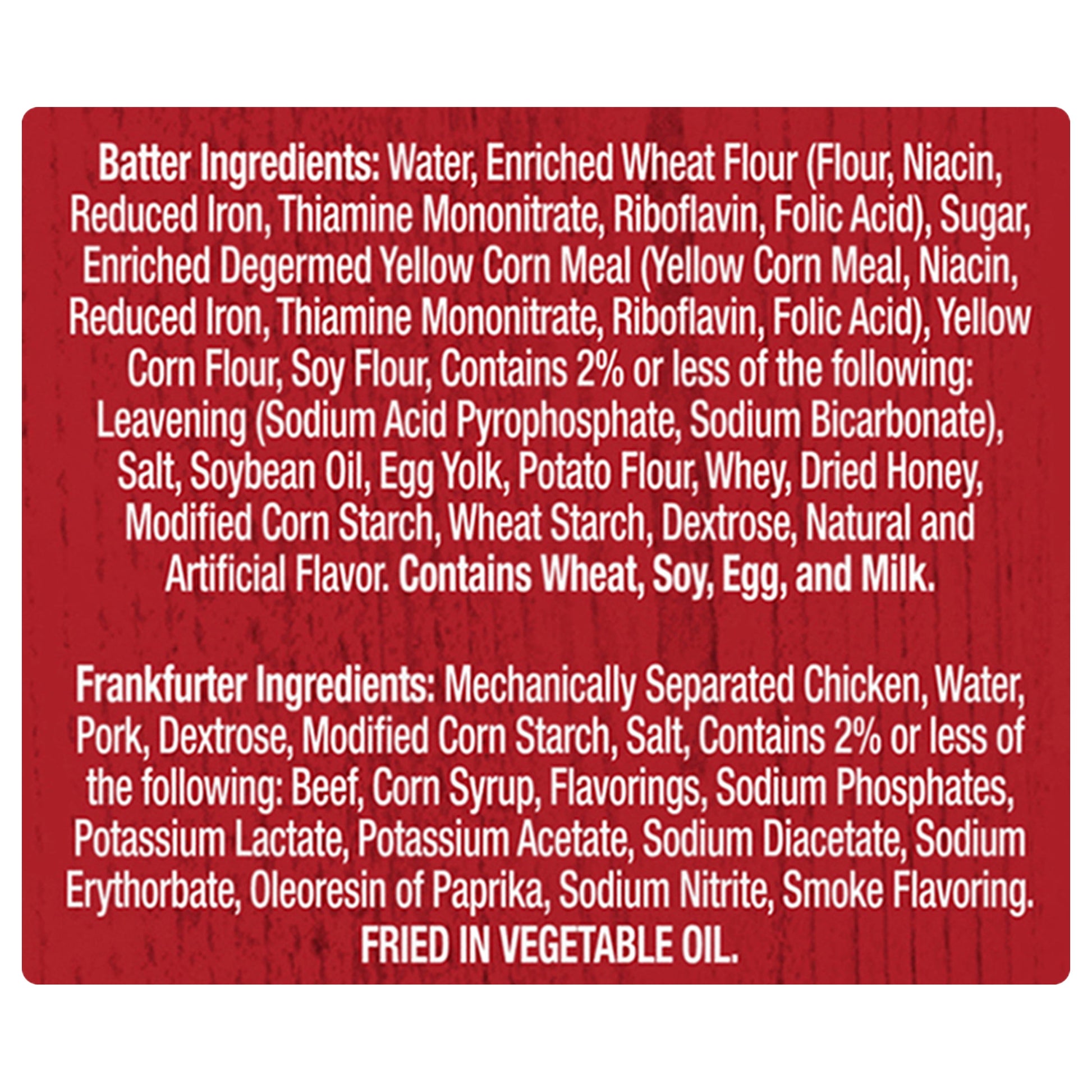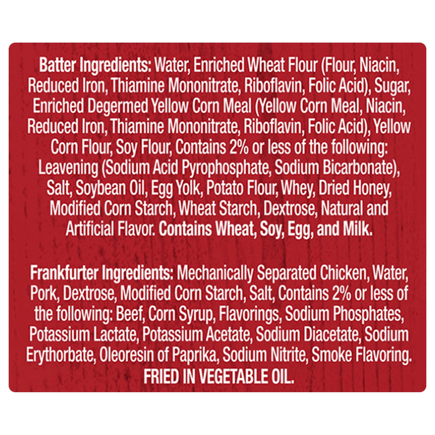 Bar-S Classic Honey Dipped Chicken and Pork Corn Dogs are made with our traditional, tasty Bar-S Franks, which have been America?s #1-selling frank for over 15 years! Each frank is dipped in a sweet, honey-flavored batter that is moist on the inside and crisp on the outside. Bar-S Classic Corn Dogs are fully cooked, then flash frozen to retain freshness. These corn dogs are vacuum-packed to prevent freezer burn and won't crack nor become soggy when microwaved.Whether it's part of a fun quick snack for the kids, a family dinner, or a late night craving, let our Corn Dogs help you and your family savor every moment. Each corn dog has 5g of protein and zero grams of trans fat.