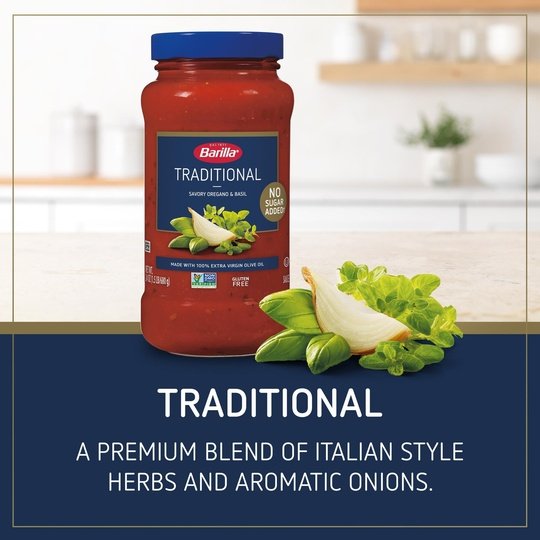 • BARILLA PREMIUM TRADITIONAL PASTA SAUCE: Deliciously distinct premium Traditional Pasta Sauce made with NO SUGAR ADDED and quality ingredients, like 100% extra virgin oil, classic chunks of sweet diced tomatoes and savory basil and oregano