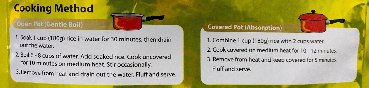 Cooking Instructions: Soak 1 cup (200g) rice in water for 30 minutes, then drain out the water. Combine soaked rice and 2 cups of water. Bring to boil. Reduce heat, cover and simmer for 10 minutes. Remove from heat and drain out the water. Fluff with fork and serve.