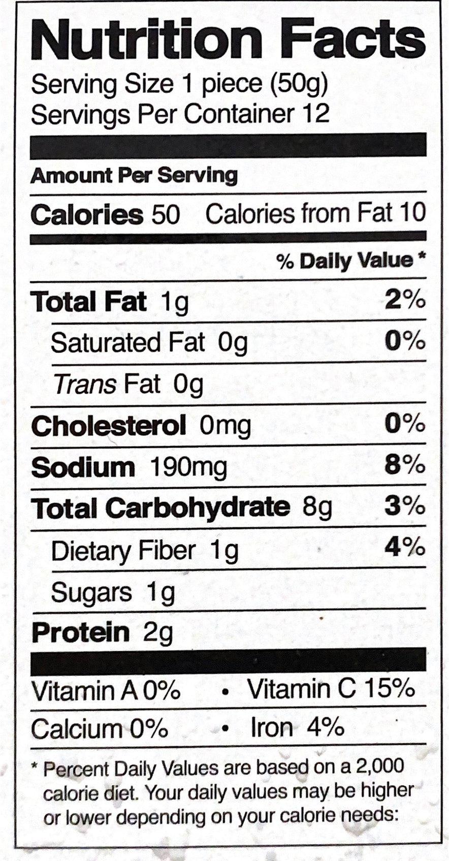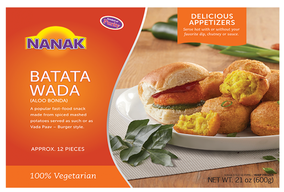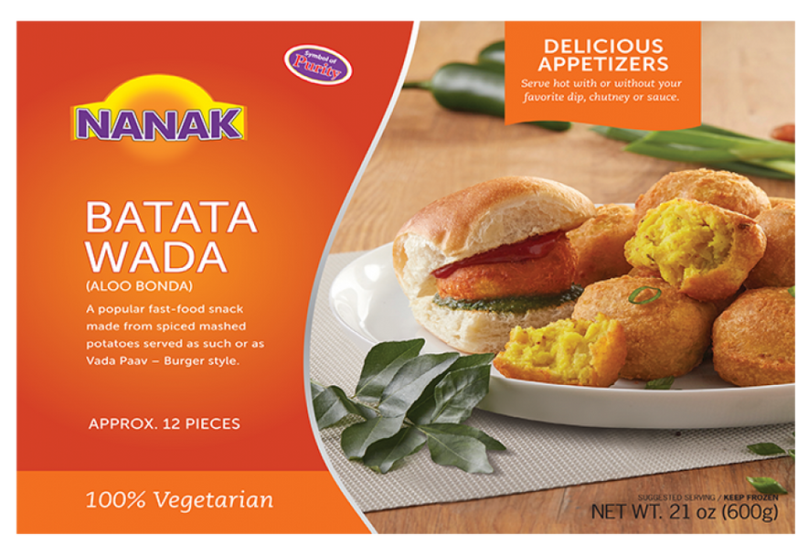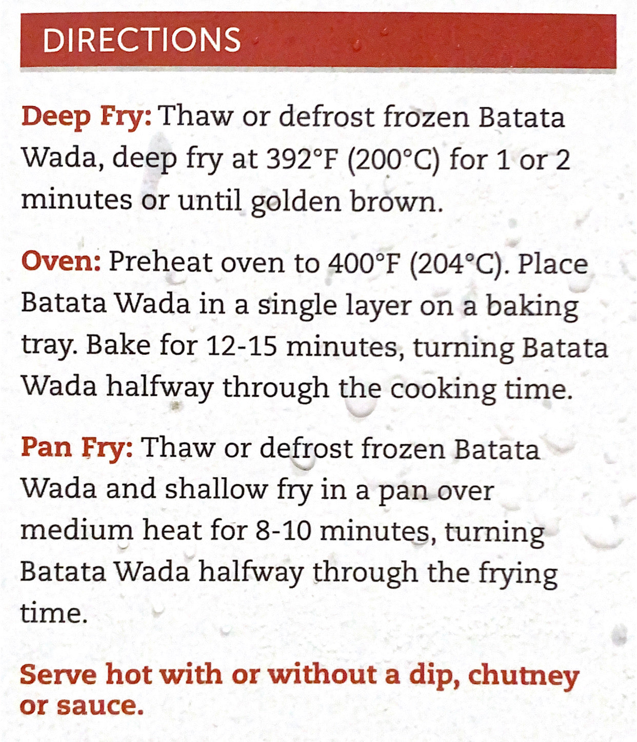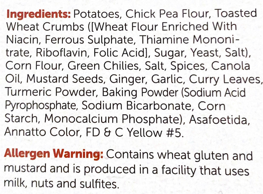 Potatoes, chick pea flour, toasted wheat crumbs (wheat flour enriched with niacin, ferrous sulphate, thiamine mononitrate, riboflavin, folic acid, sugar, yeast, salt), corn flour, green chilies, salt, spices, canola oil, mustard seeds, ginger, garlic, curry leaves, turmeric powder, baking powder (sodium acid pyrophosphate, sodium bicarbonate, corn starch, monocalcium phosphate), asafetida.