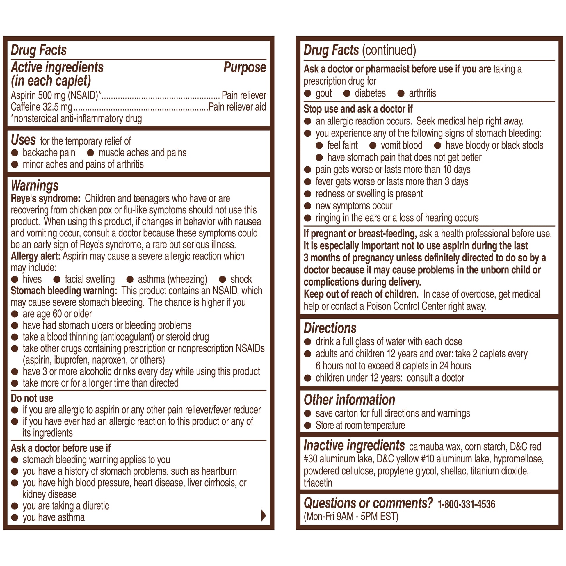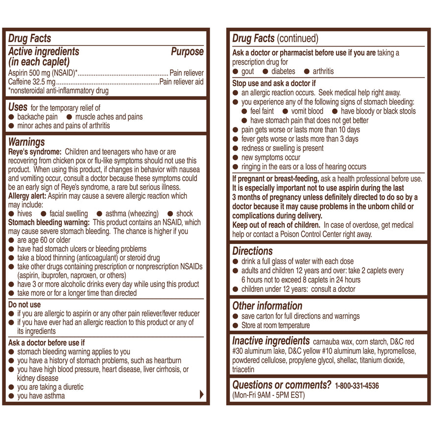 For 125 years, Bayer Aspirin has been a leading aspirin brand in pain relief. Bayer Back and Body Extra Strength Aspirin is a powerful pain reliever with a dual action formula containing 500mg aspirin and 32.5mg of caffeine to help boost the pain-relieving effects of aspirin. These extra strength back andbody pain relief pills provide safe, proven pain relief, when taken as directed, at the site of backache and muscle aches and pains. Each 500mg aspirin tablet is coated for ease of swallowing and is free of sodium. Adults and children over 12 take 1 or 2 caplets every 6 hours with a full glass of water, not exceeding 8 caplets in a 24-hour period. Use as directed.