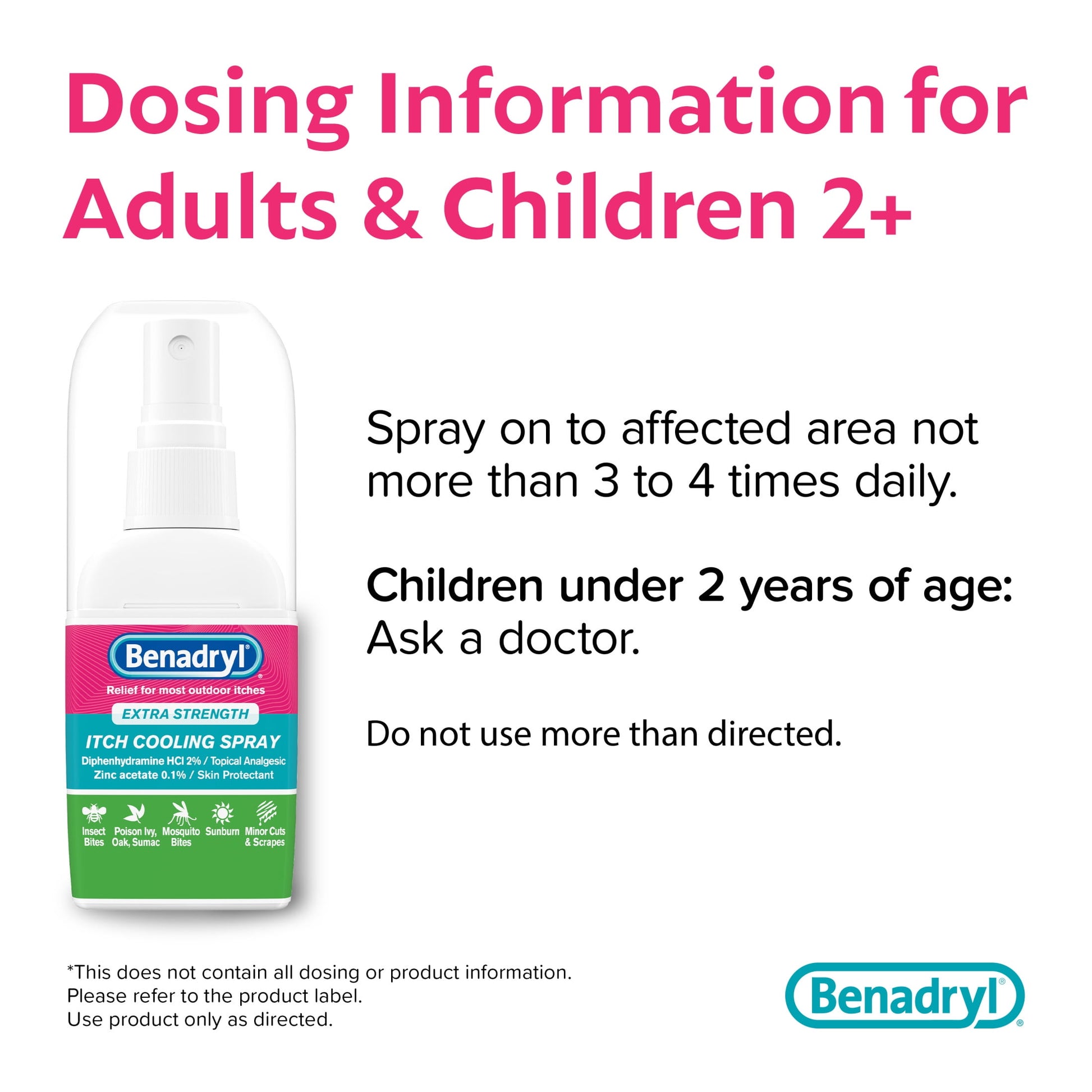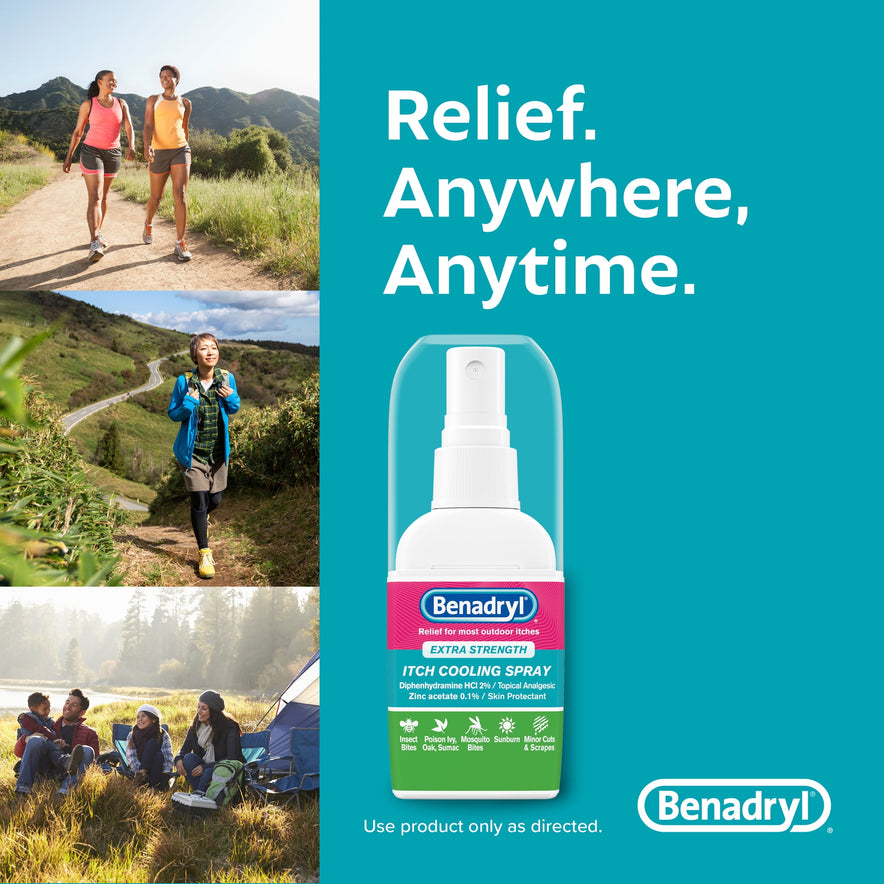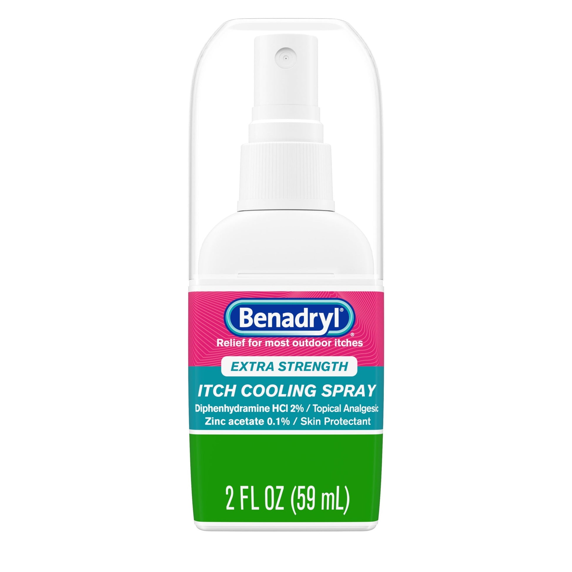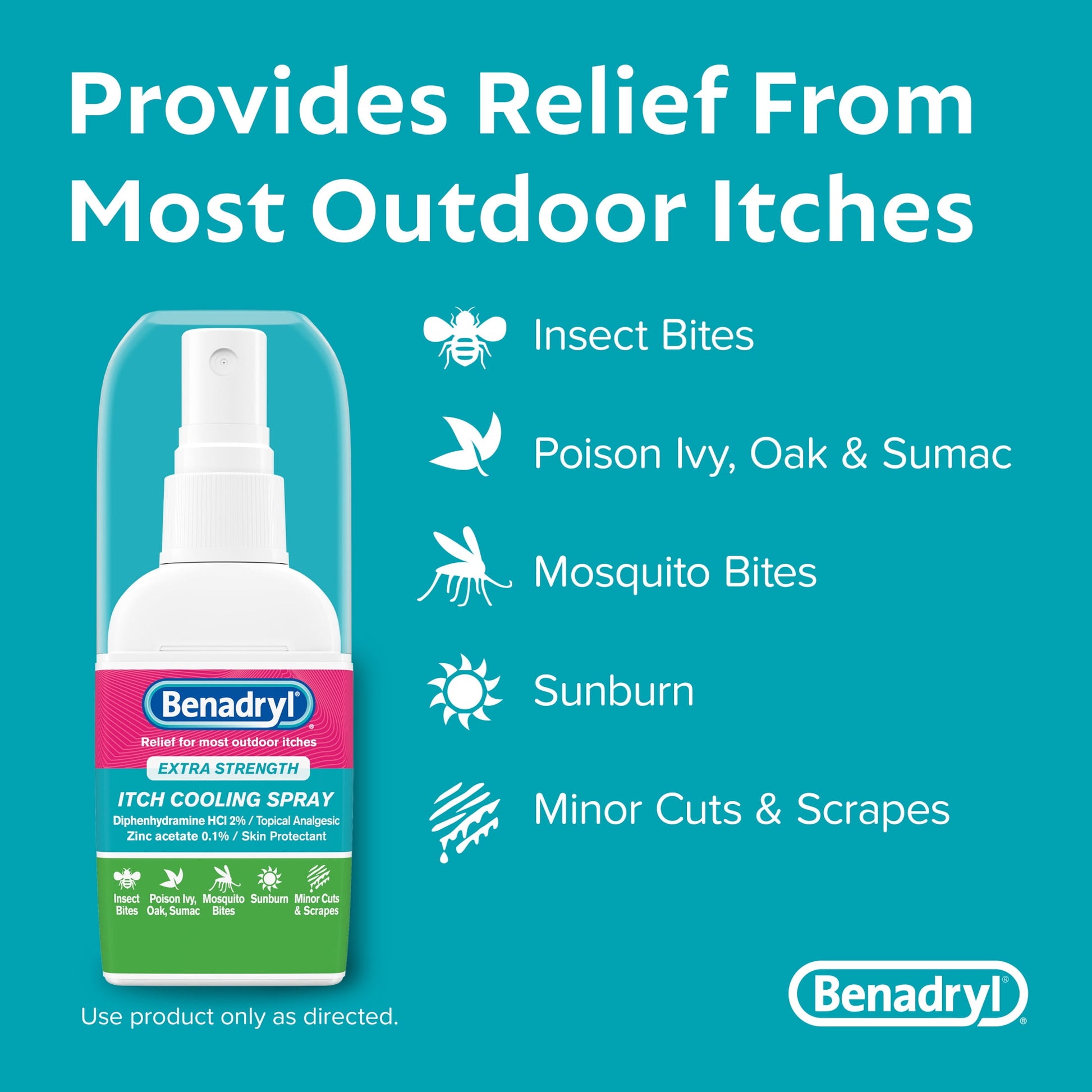 Benadryl Extra Strength Anti-Itch Cooling Spray provides fast relief from skin irritation and itching. Made with 2% diphenhydramine HCI topical analgesic and 0.1% zinc acetate skin protectant, this itch relief spray begins to work on contact to relieve the pain and itching associated with most outdoor itches including insect bites, sunburn, scrapes, and minor skin irritations, burns, and cuts. It also dries rashes caused by poison ivy, poison oak, and poison sumac. Benadryl Extra Strength Itch Cooling Spray works when you need it most and is intended for ages two and up.