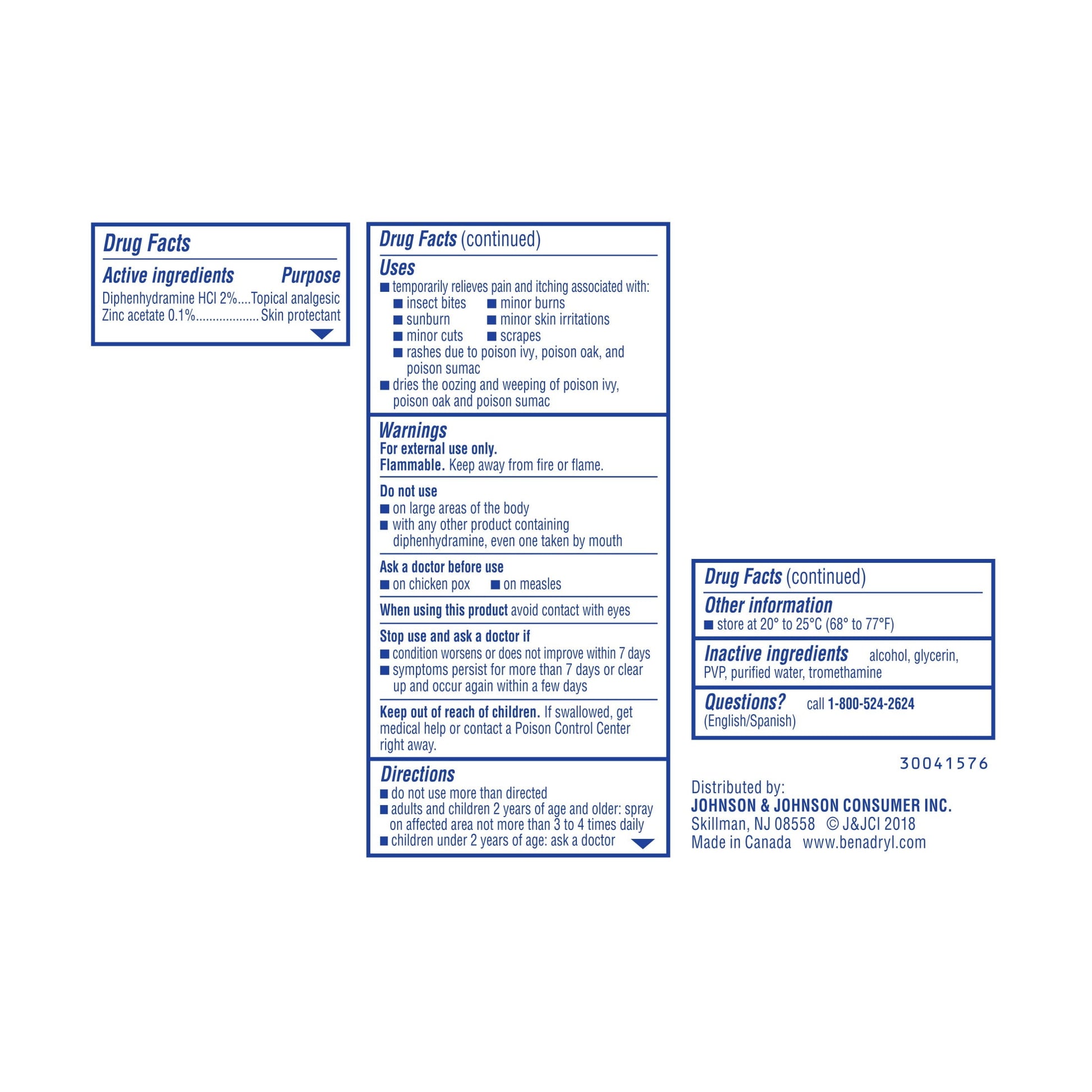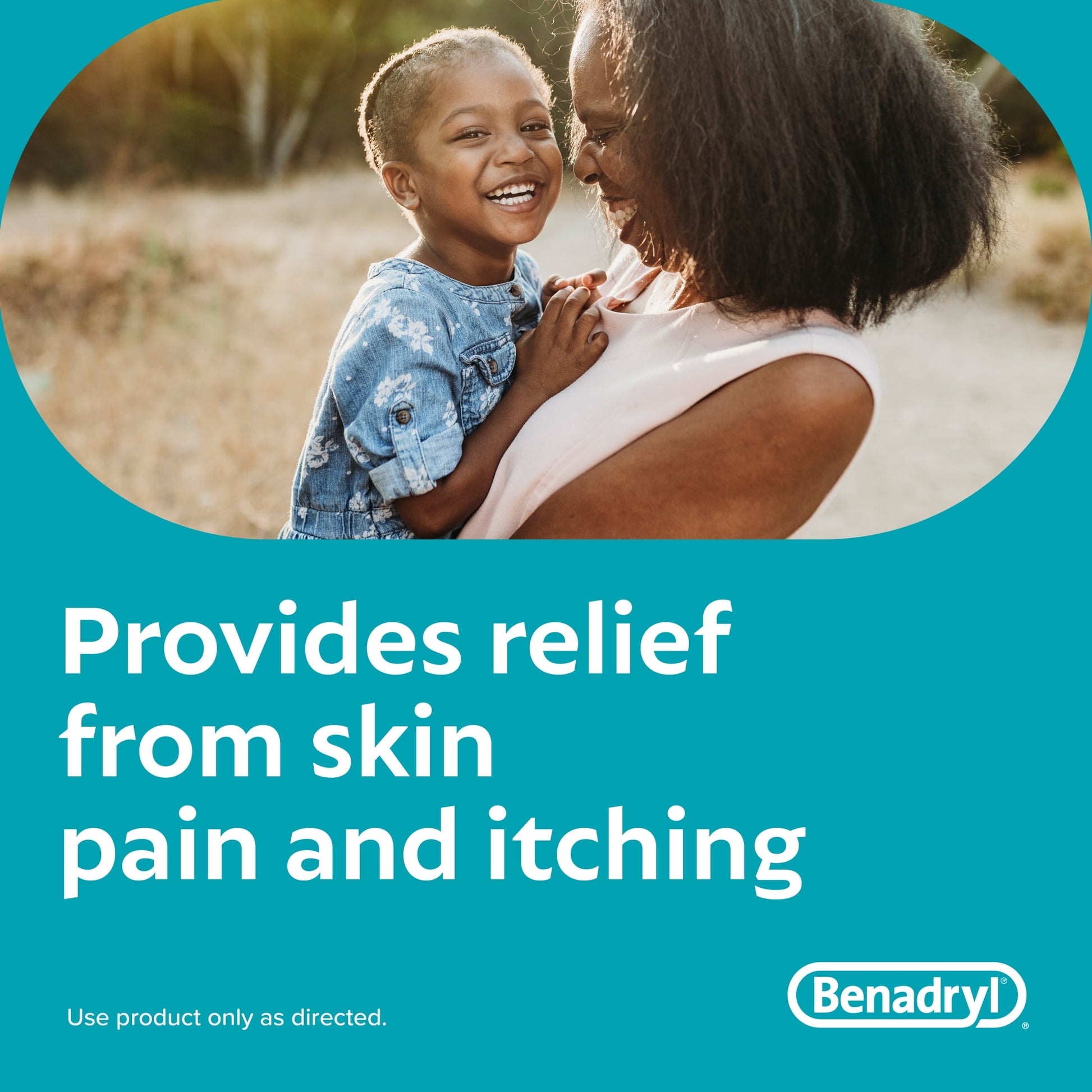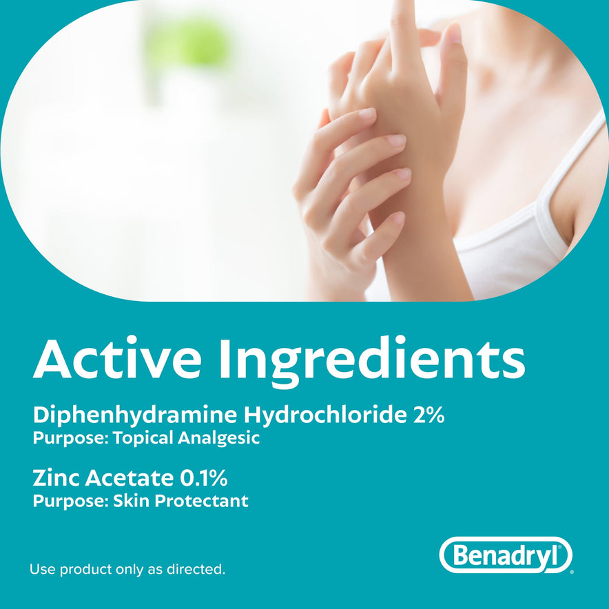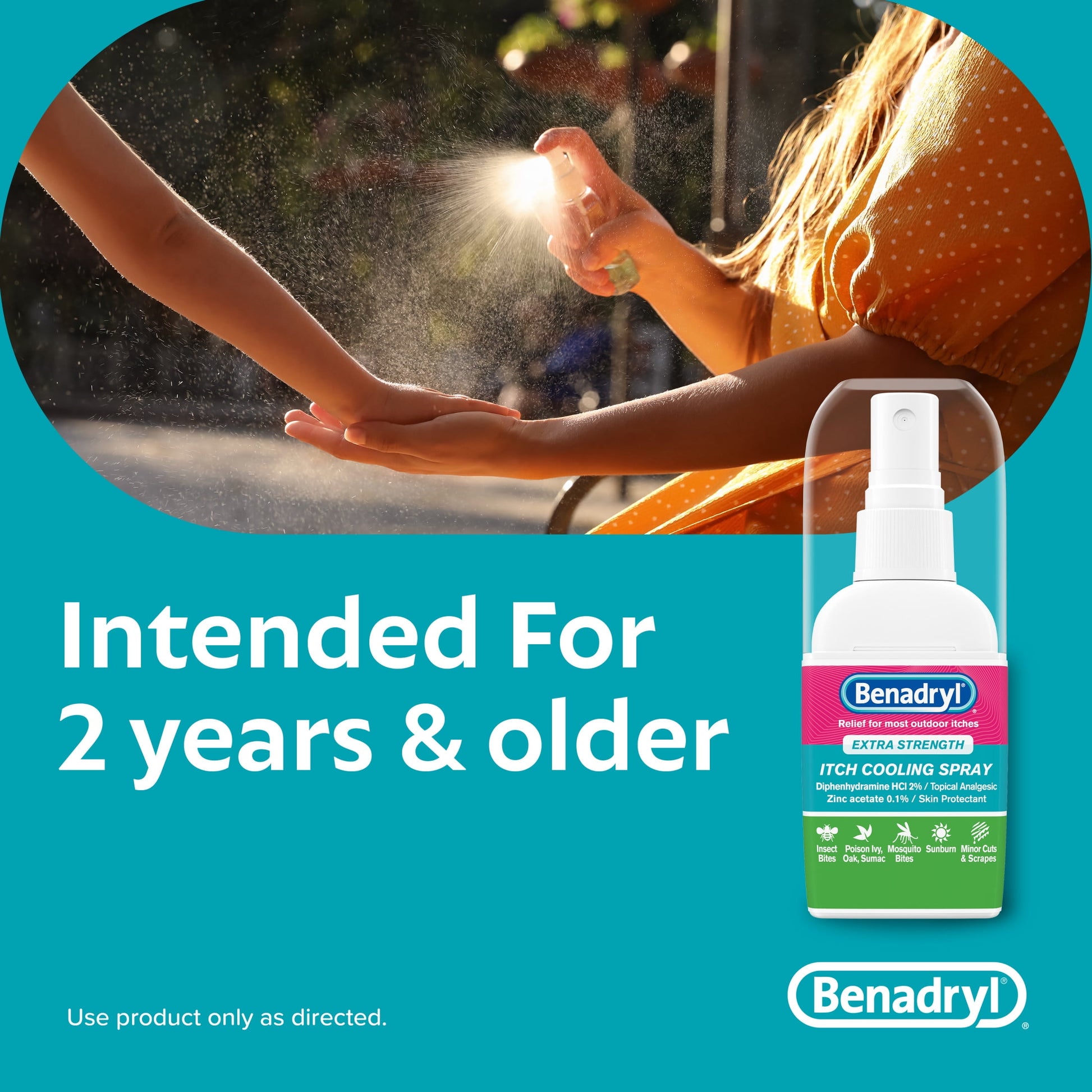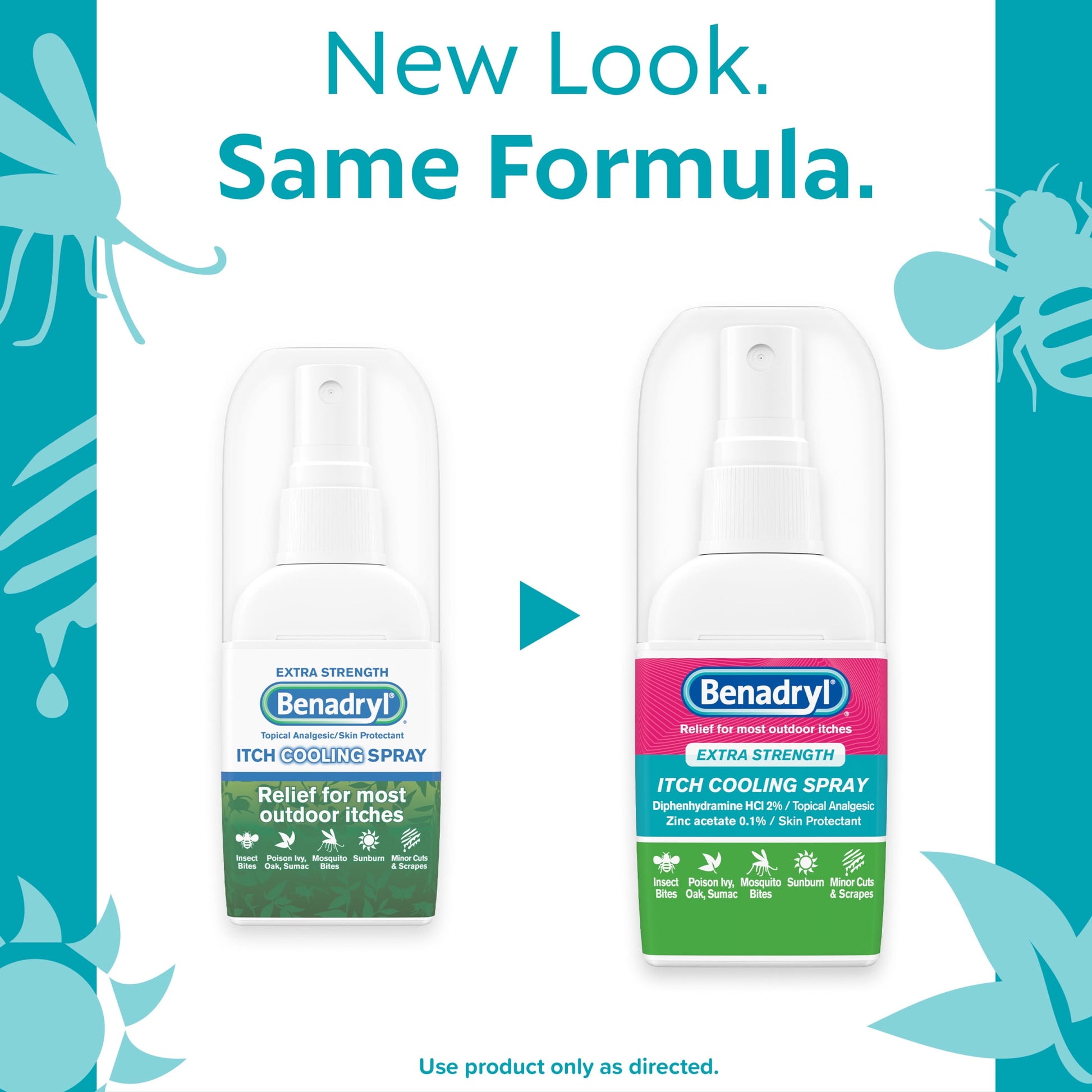 Benadryl Extra Strength Anti-Itch Cooling Spray provides fast relief from skin irritation and itching. Made with 2% diphenhydramine HCI topical analgesic and 0.1% zinc acetate skin protectant, this itch relief spray begins to work on contact to relieve the pain and itching associated with most outdoor itches including insect bites, sunburn, scrapes, and minor skin irritations, burns, and cuts. It also dries rashes caused by poison ivy, poison oak, and poison sumac. Benadryl Extra Strength Itch Cooling Spray works when you need it most and is intended for ages two and up.