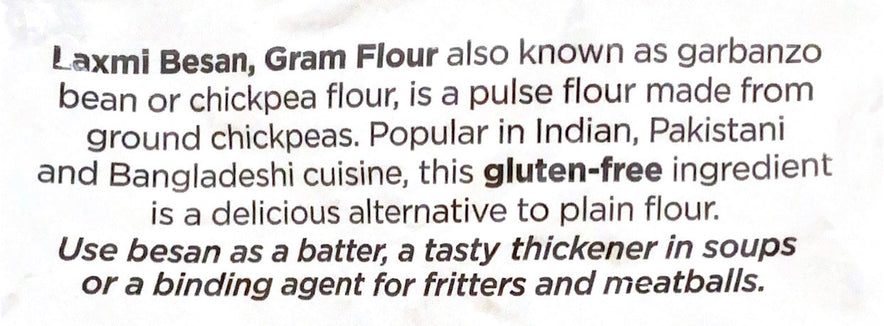 Laxmi Besan, Gram Flour also known as garbanzo bean or chickpea flour, is a pulse flour made from ground chickpeas. Popular in Indian, Pakistani and Bangladeshi cuisine, this gluten-free ingredient is a delicious alternative to plain flour. Use besan as a batter, a tasty thickener in soups or a binding agent for fritters and meatballs.