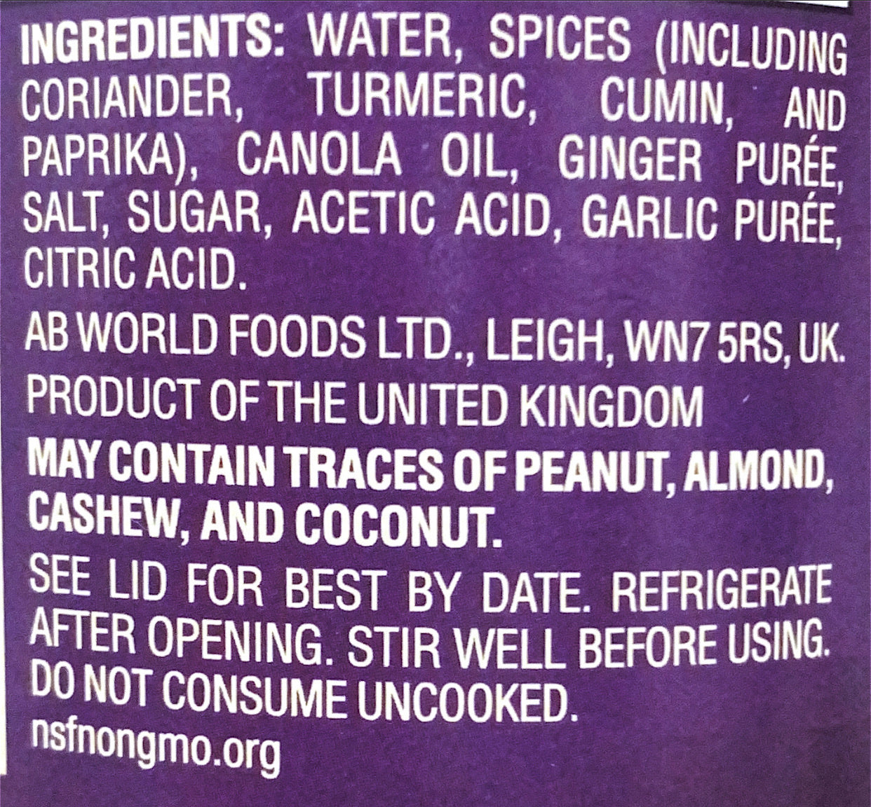 INGREDIENTS: WATER, SPICES (INCLUDING CORIANDER, TURMERIC, CUMIN, AND PAPRIKA), CANOLA OIL, GINGER PURÉE, SALT, SUGAR, ACETIC ACID, GARLIC PURÉE, CITRIC ACID.