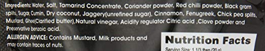 Water, salt, tamarind concerntrate, coriander powder, red chilli powder, black gram, sugar, cumin powder, grated coconut, jaggarey, cinnamon powder