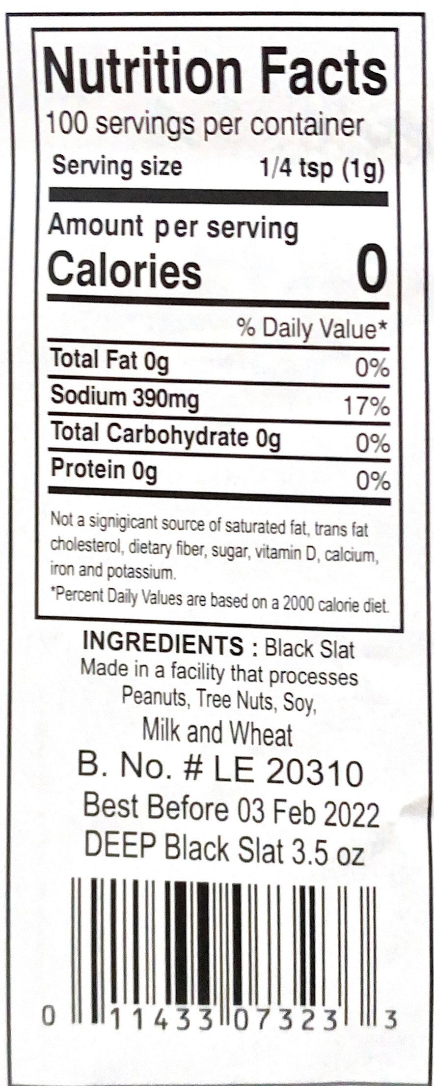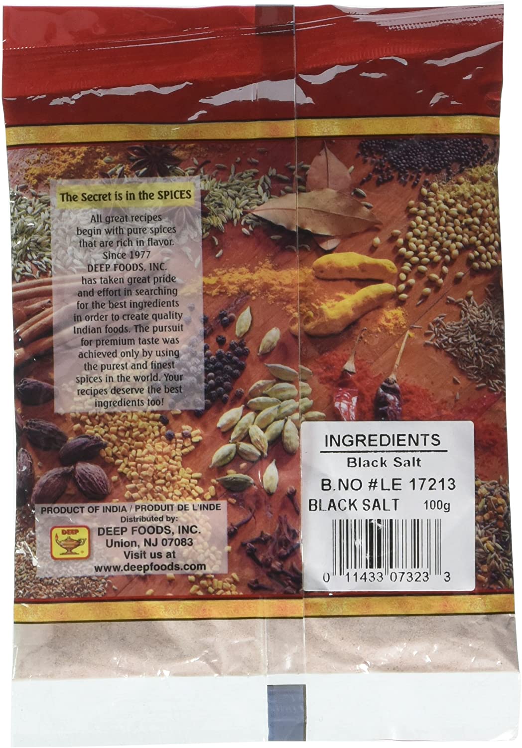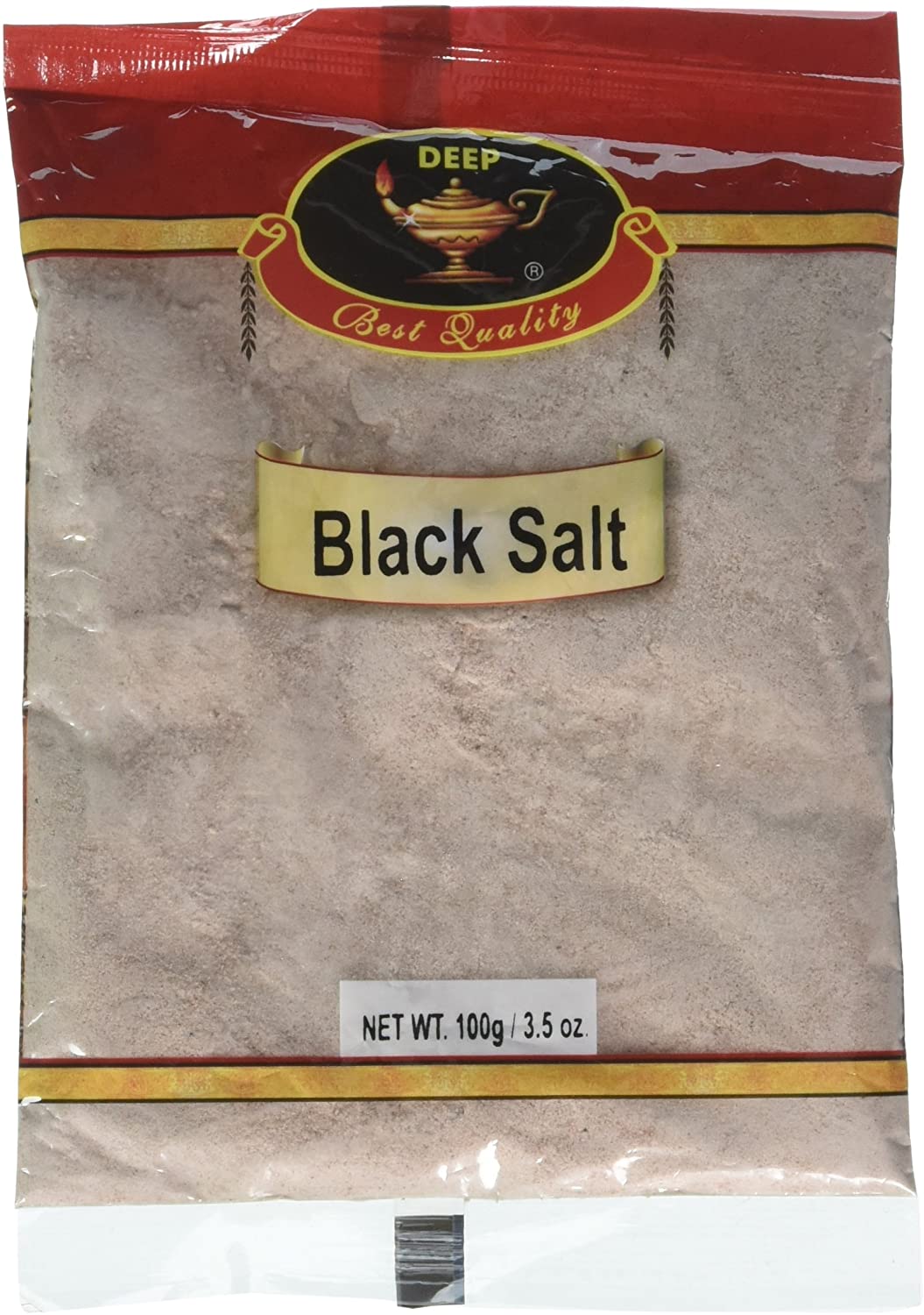 DEEP Black Salt 100 gm | Kala Namak or Black Salt is a special type of Indian mineral salt. It is actually pinkish grey rather than black and has a very distinctive sulfurous mineral taste. This Black Salt is used in Indian cuisine as a condiment and is added to chaats, chutneys, raitas and many other savory Indian snacks. The ‘Black salt’ is collected from deep mines in India in black-brown salt blocks and contains several important minerals, including iron and sulfur. When it is ground, it becomes brown pink and has a light taste of sulfur. Kala Namak is used sparingly in the preparation of raitas, yogurt dishes, salads, and even fruit salads. Also a welcome addition as a finishing salt to fried noodle and rice dishes. It is not recommended as a cooking salt, as the sulfur tends to overpower. Kala Namak is very popular with vegans, vegetarians, and Ayurveda devotees, who appreciate its cooling effect and digestive qualities.