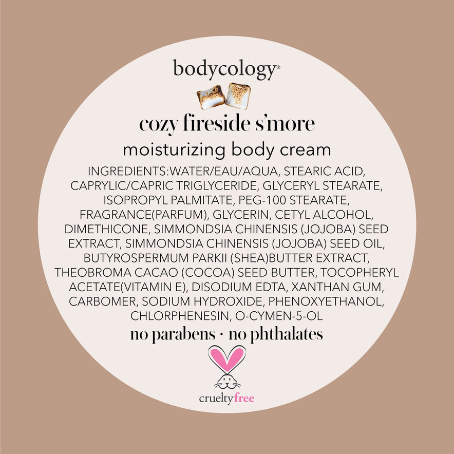 Moisturize your skin with Bodycology Cozy Fireside S'more Body Cream. Formulated with a rich butter complex containing Shea butter, Cocoa butter and Jojoba oil, this luxurious cream leaves skin feeling soft for hours. Simply smooth over skin, giving special care to dry or rough areas.