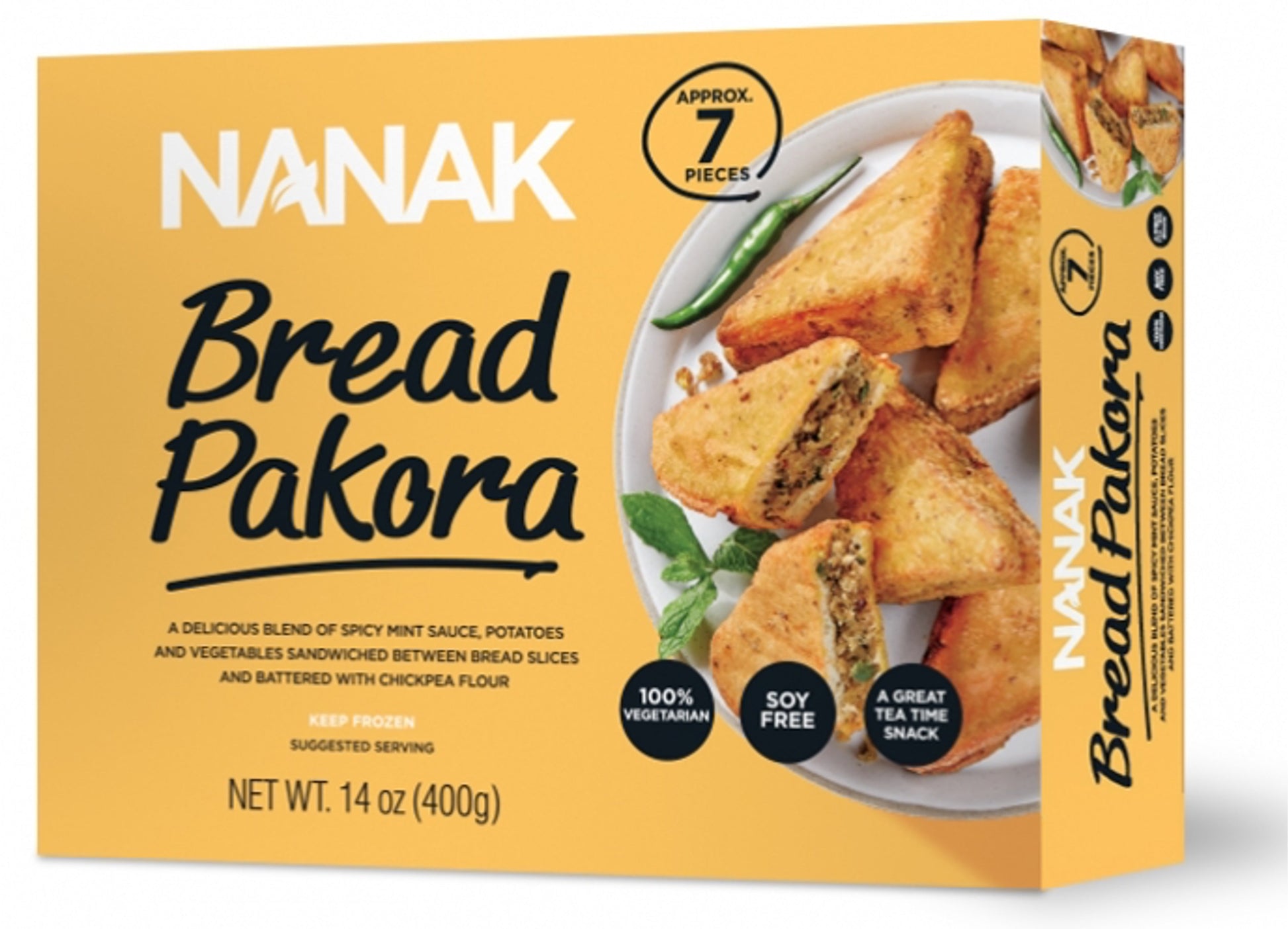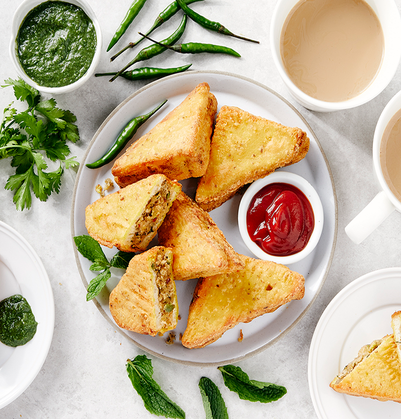 A delicious blend of spicy mint sauce , potatoes and vegetables sandwiched between bread slices and battered with chickpea flour.