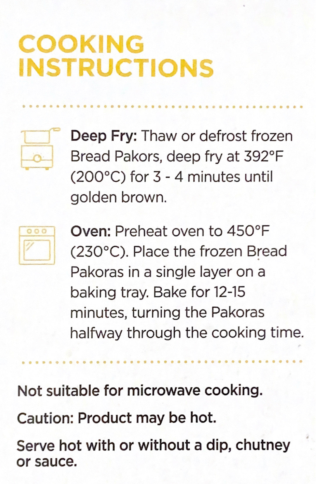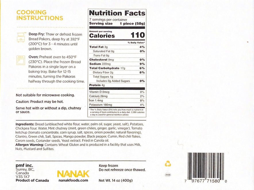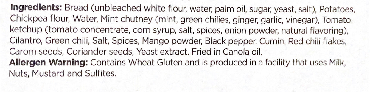 Bread (unbleached white flour, water, palm oil, sugar, yeast, salt), Potatoes, Chickpea flour, Water, Mint chutney (mint, green chilies, ginger, garlic, vinegar), Tomato ketchup (tomato concentrate, corn syrup, salt, spices, onion powder, natural flavouring), Cilantro, Green chili, Salt, Spices, Mango powder, Black pepper, Cumin, Red chili flakes, Carom seeds, Coriander seeds, Yeast extract. Fried in canola oil