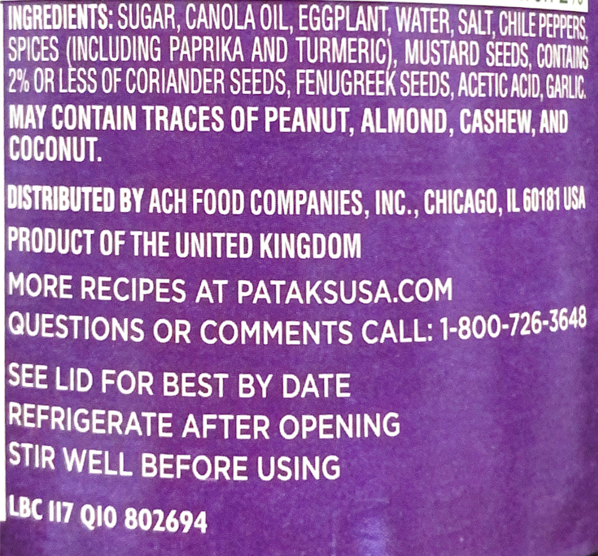 INGREDIENTS: SUGAR, CANOLA OIL, EGGPLANT CHUNKS, WATER, SALT, CHILE PEPPERS, SPICES (INCLUDING PAPRIKA AND TURMERIC), MUSTARD SEEDS, CONTAINS 2% OR LESS OF CORIANDER SEEDS, FENUGREEK SEEDS, ACETIC ACID, GARLIC.