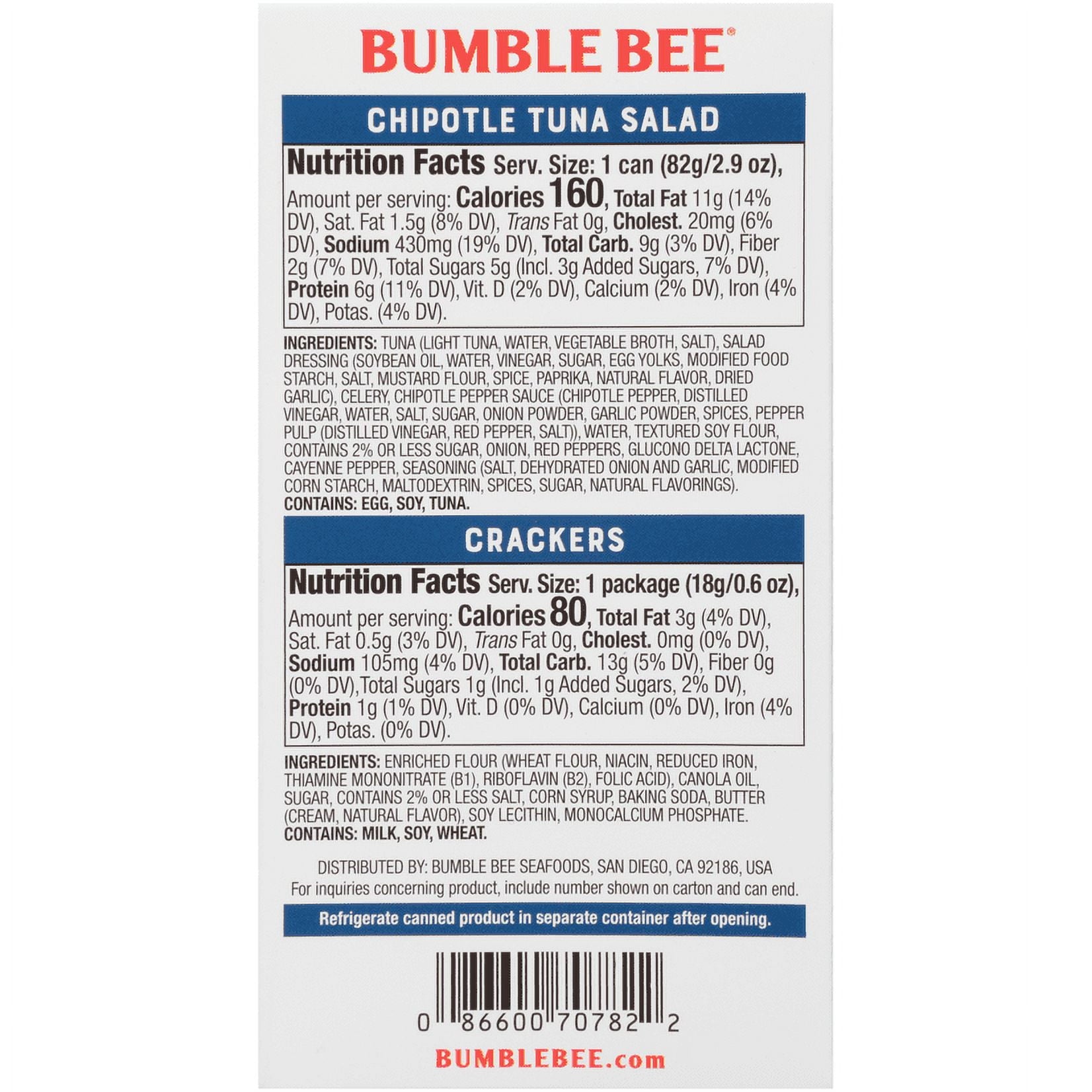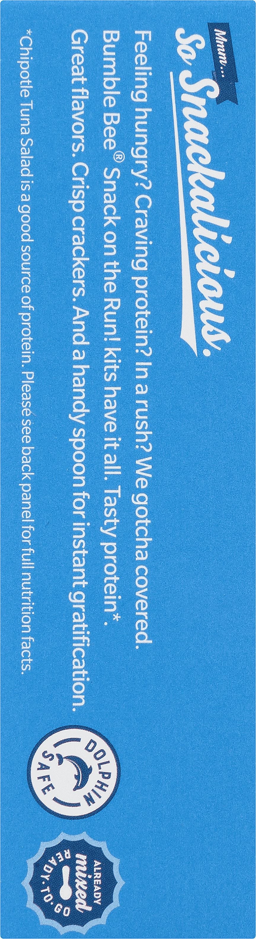 DELICIOUS TUNA SNACK WITH CRACKERS: 3.5 ounce Bumble Bee Snack on the Run! Chipotle Tuna Salad with Crackers Kits will satisfy you and your family whenever you want a tasty tuna snack or quick lunch on the go