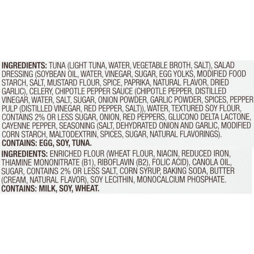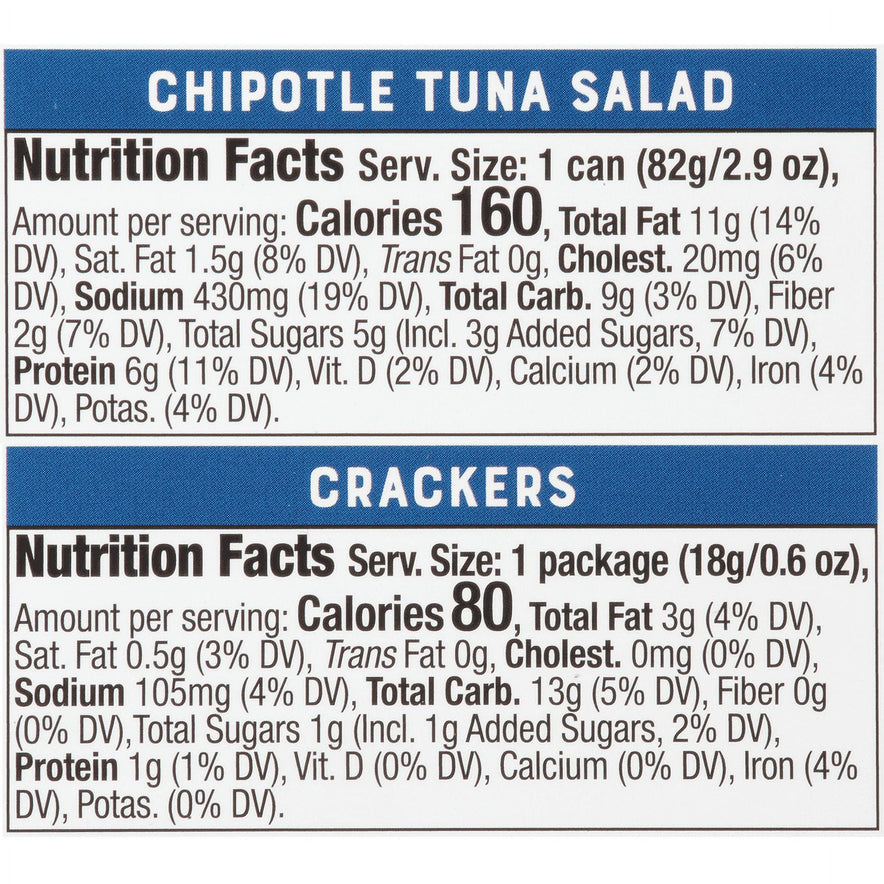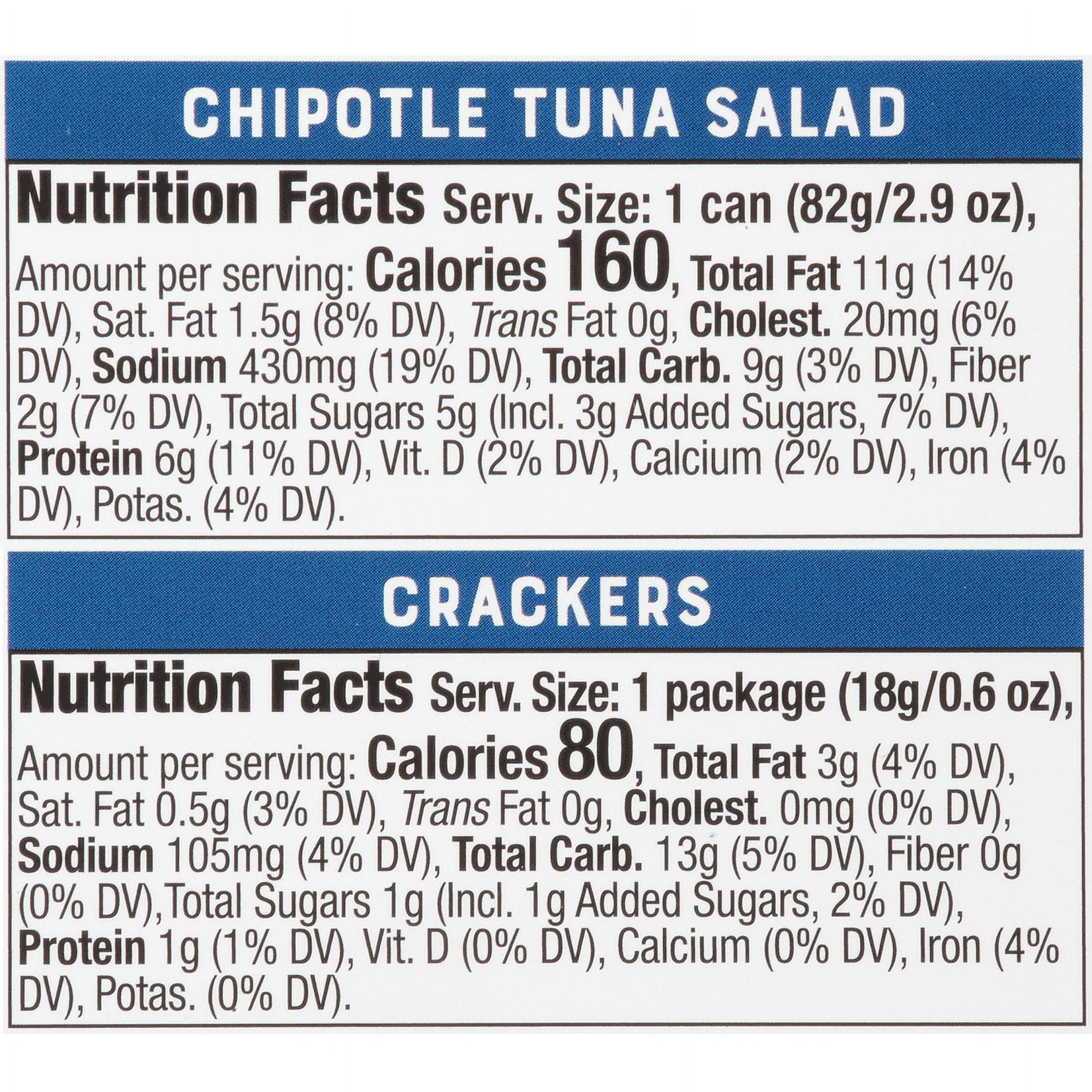 CHIPOTLE TUNA SALAD: Premium chipotle flavored tuna salad made with Bumble Bee tuna fish, mixed and ready to eat; Includes canned tuna salad, six crackers and spoon; Simply open the box and enjoy