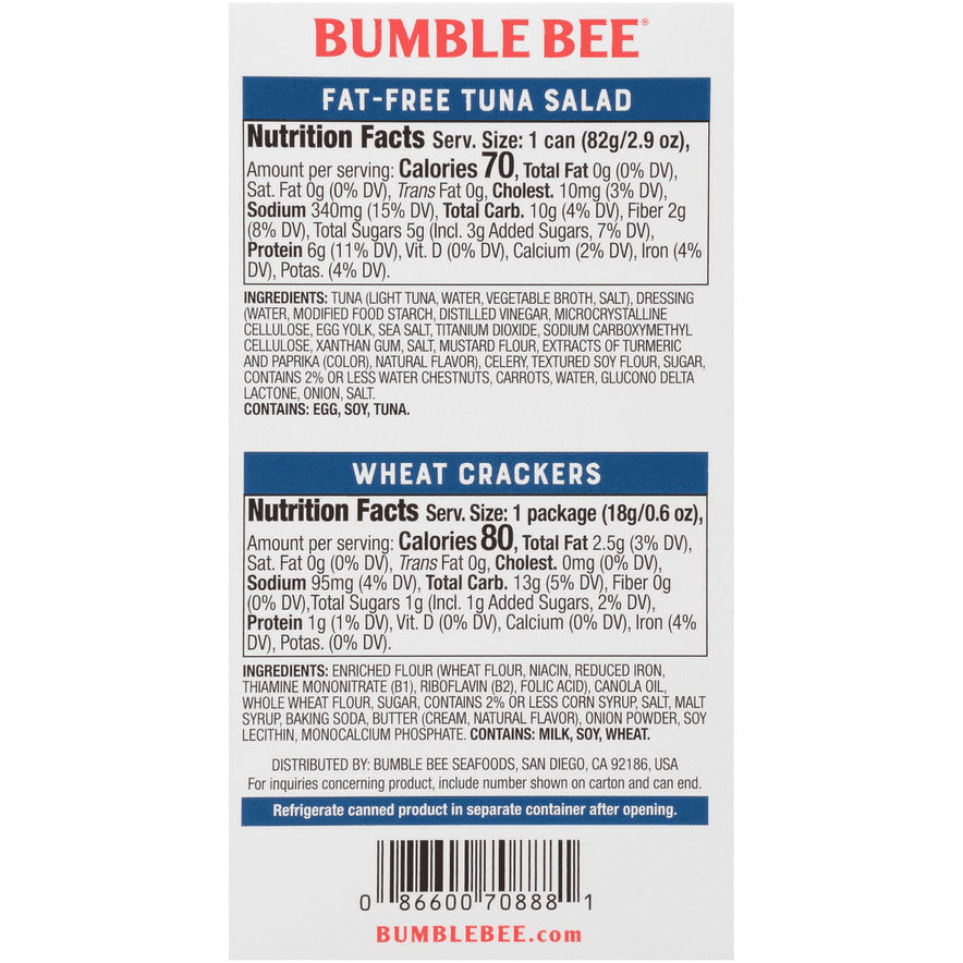 DELICIOUS TUNA SNACK WITH CRACKERS: 3.5 ounce Bumble Bee Snack on the Run! Fat-Free Tuna Salad with Crackers Kits will satisfy you and your family whenever you want a tasty tuna snack or quick lunch on the go