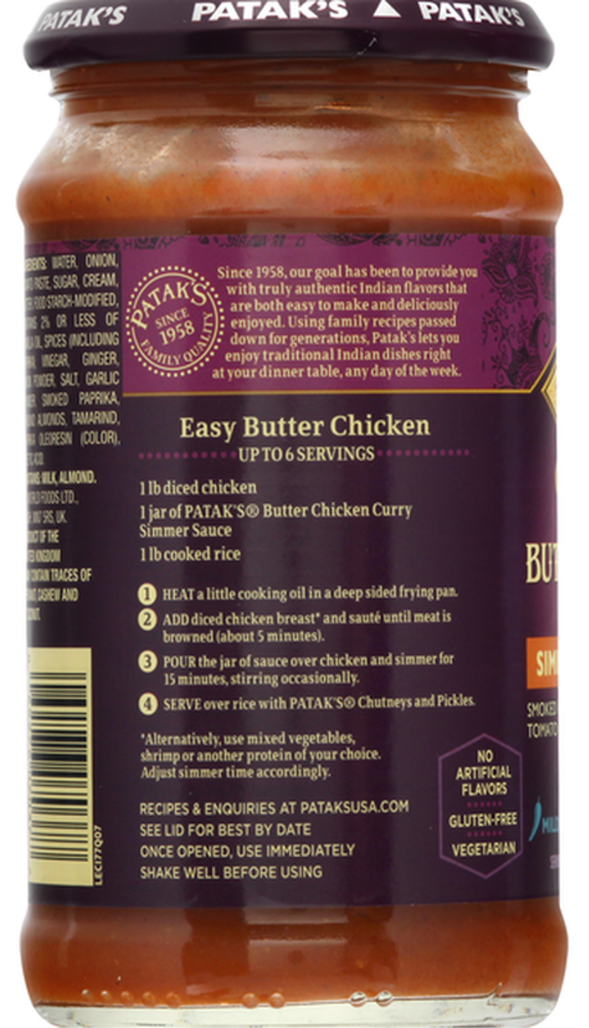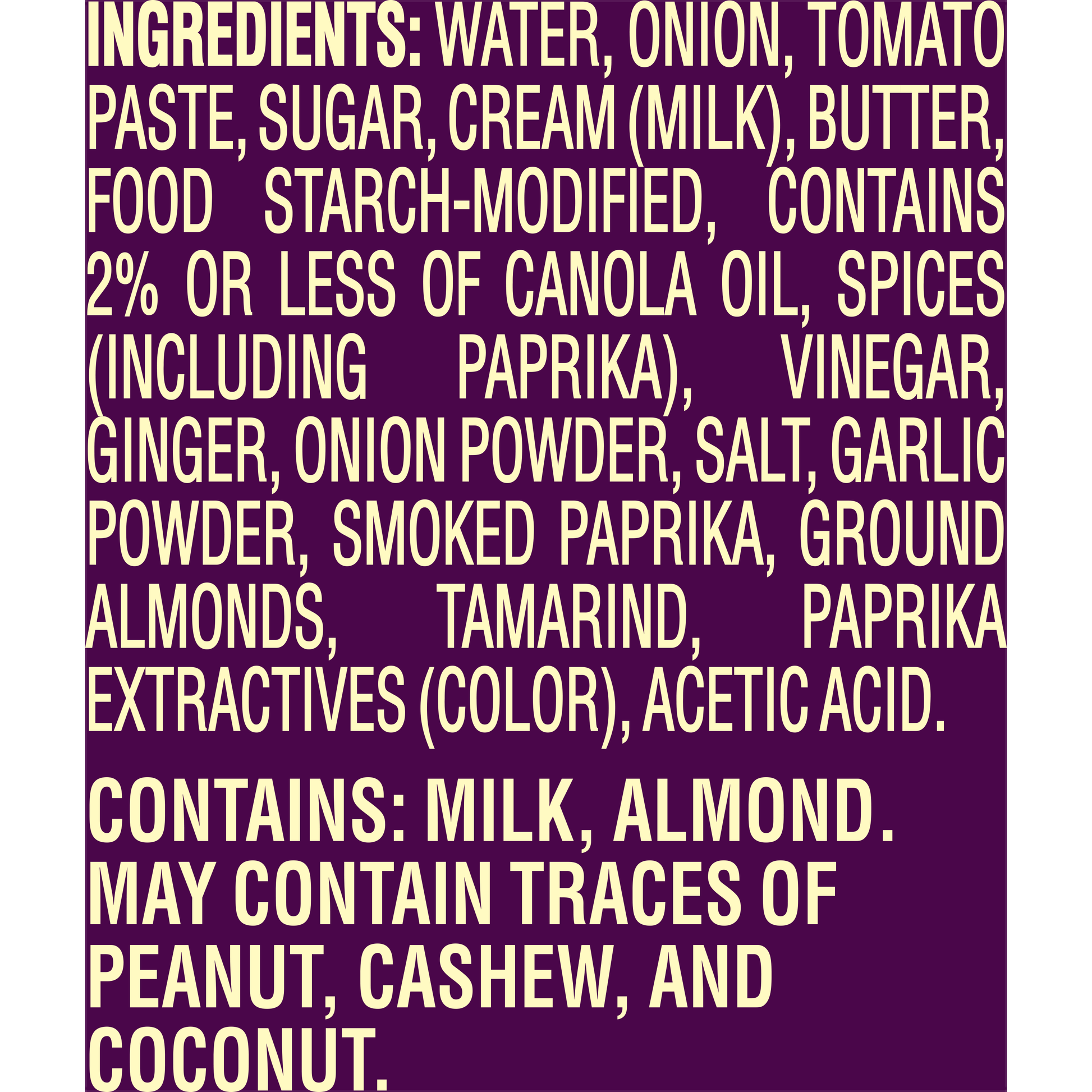 INGREDIENTS: WATER, ONION, TOMATO PASTE, SUGAR, CREAM, BUTTER, FOOD STARCH-MODIFIED, CONTAINS 2% OR LESS OF CANOLA OIL, SPICES (INCLUDING PAPRIKA), VINEGAR, GINGER, ONION POWDER, SALT, GARLIC POWDER, SMOKED PAPRIKA, GROUND ALMONDS, TAMARIND, PAPRIKA OLEORESIN (COLOR), ACETIC ACID.