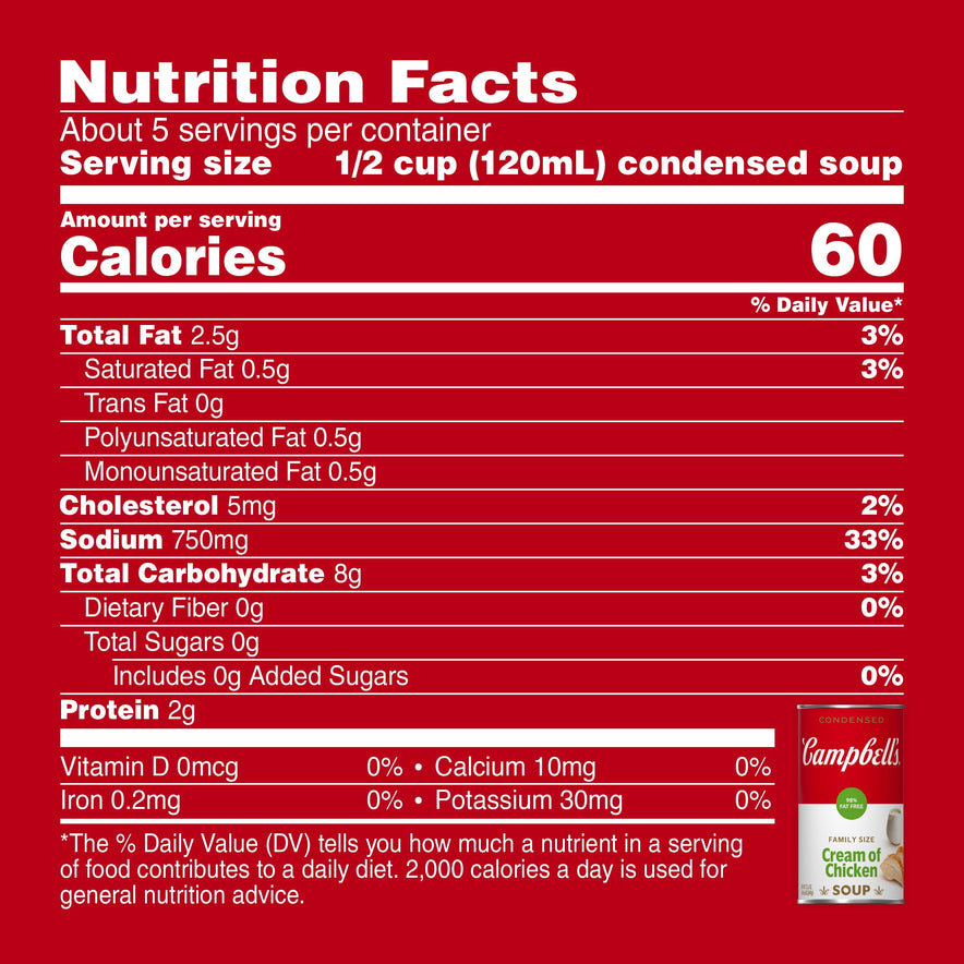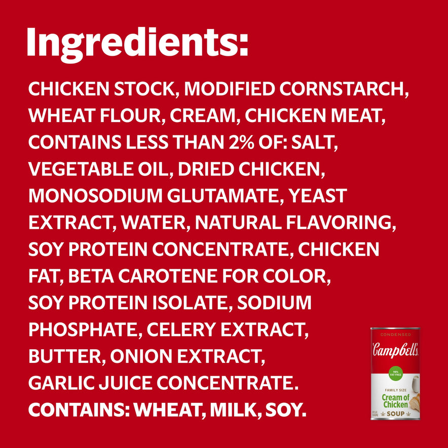 GET READY TO CREATE WITH EVERY CAN OF SOUP: This Cream of Chicken Soup with no sugar added* instantly adds homestyle quality, farm-grown ingredients, and protein to round out any delicious recipe. *Not a low-calorie food. See Nutrition Panel for calorie and sugar content.