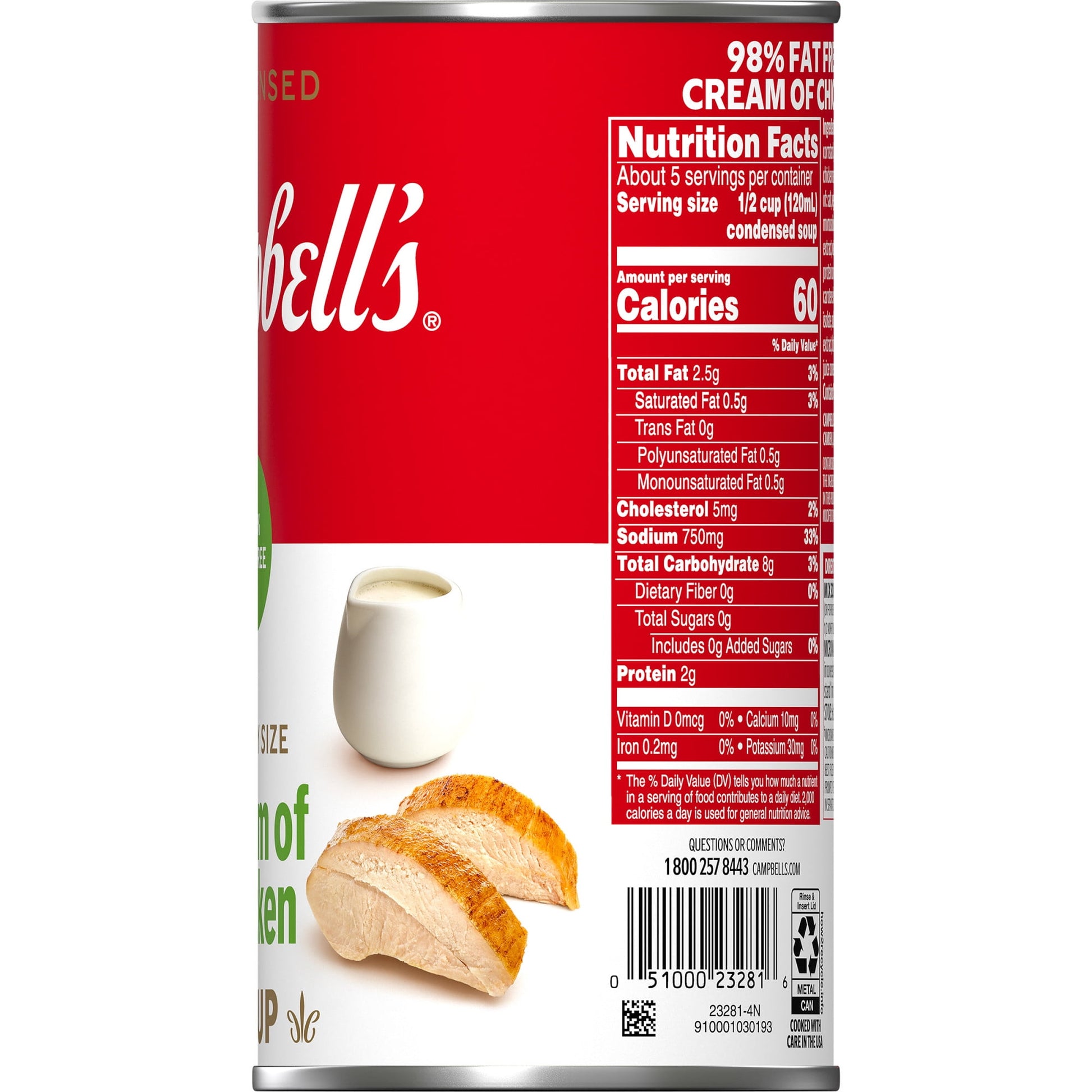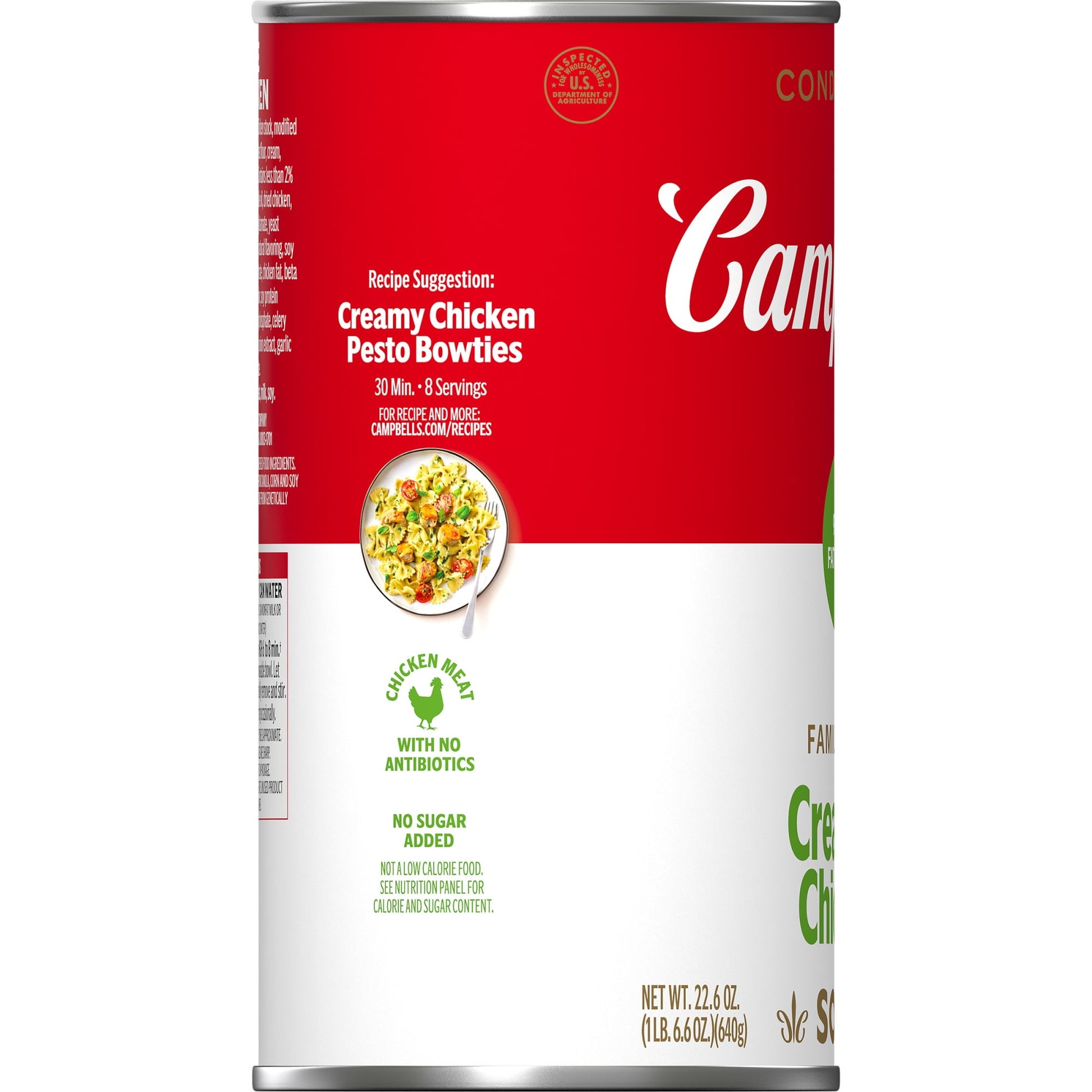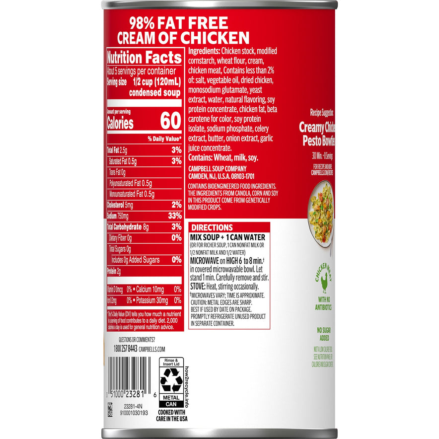 Campbell’s Condensed 98% Fat Free Cream of Chicken Soup is just the beginning of any great recipe. Join Campbell’s in cooking in the kitchen with Cream of Chicken Soup with no sugar added* that instantly adds creamy comfort to any dish. This Cream of Chicken Soup starts with high-quality chicken stock, tender chicken raised without antibiotics, and farm fresh cream. Try Campbell’s 98% Fat Free Cream of Chicken Soup as the start of great recipes like creamy pesto chicken bowtie pasta! M’m! M’m! Good! *Not a low-calorie food. See Nutrition Panel for calorie and sugar content. This product is packaged in a metal can, and is shelf-stable/ambient.