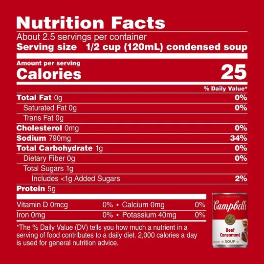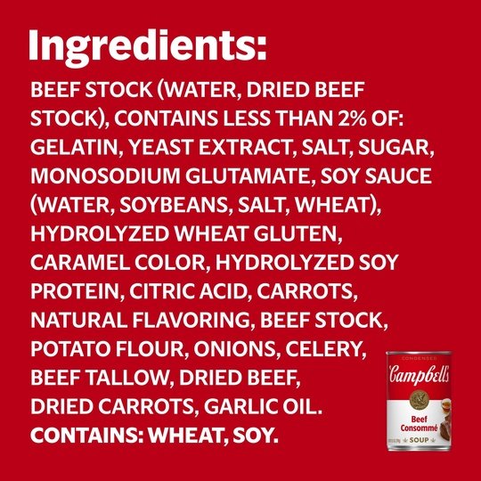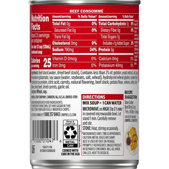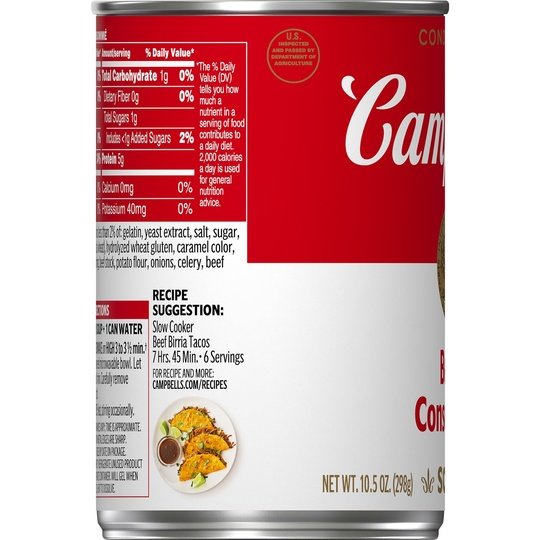 Add deep, savory and rich flavor to your favorite dishes with Campbell's Condensed Beef Consomme. Made with high-quality beef stock, Campbell's Beef Consomme provides a delicious foundation to any recipe. Use it as a stew or soup base or to make hearty dishes like slow cooker beef birria tacos and flavor-packed Southwest skillets. This canned soup is also great for creating homemade gravies and marinades. A convenient alternative to beef bullion, Campbell’s Beef Consomme is a year-round pantry staple and a must-have for whipping up something quick and easy. Simply mix the condensed soup with 1 can of water and microwave on high for 3 to 3.5 minutes in a covered microwave-safe bowl, or heat in a pot on the stove, stirring occasionally. Each 10.5 oz recyclable can contains about 2.5 servings of microwave soup and features a non-BPA lining. From Beef Consomme to Chicken Noodle and everything in between, Campbell's makes delicious soups in flavors your family knows and loves, with quality, farm-grown ingredients in every can. M'm! M'm! Good! This product is packaged in a metal can, and is shelf-stable/ambient.