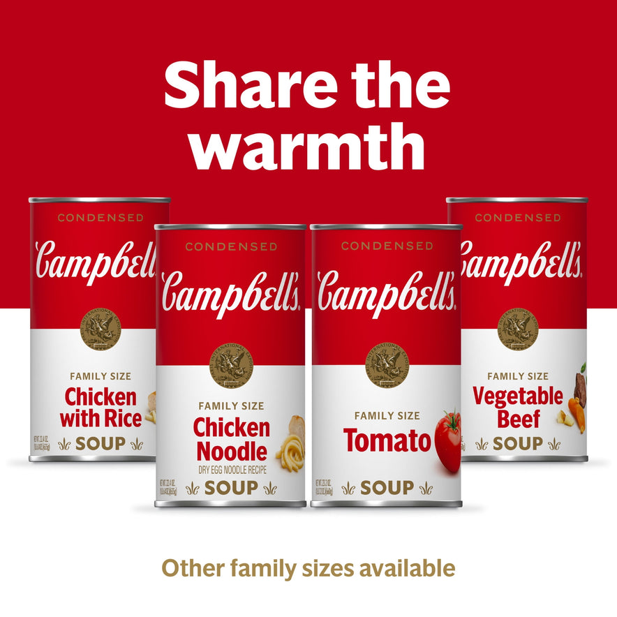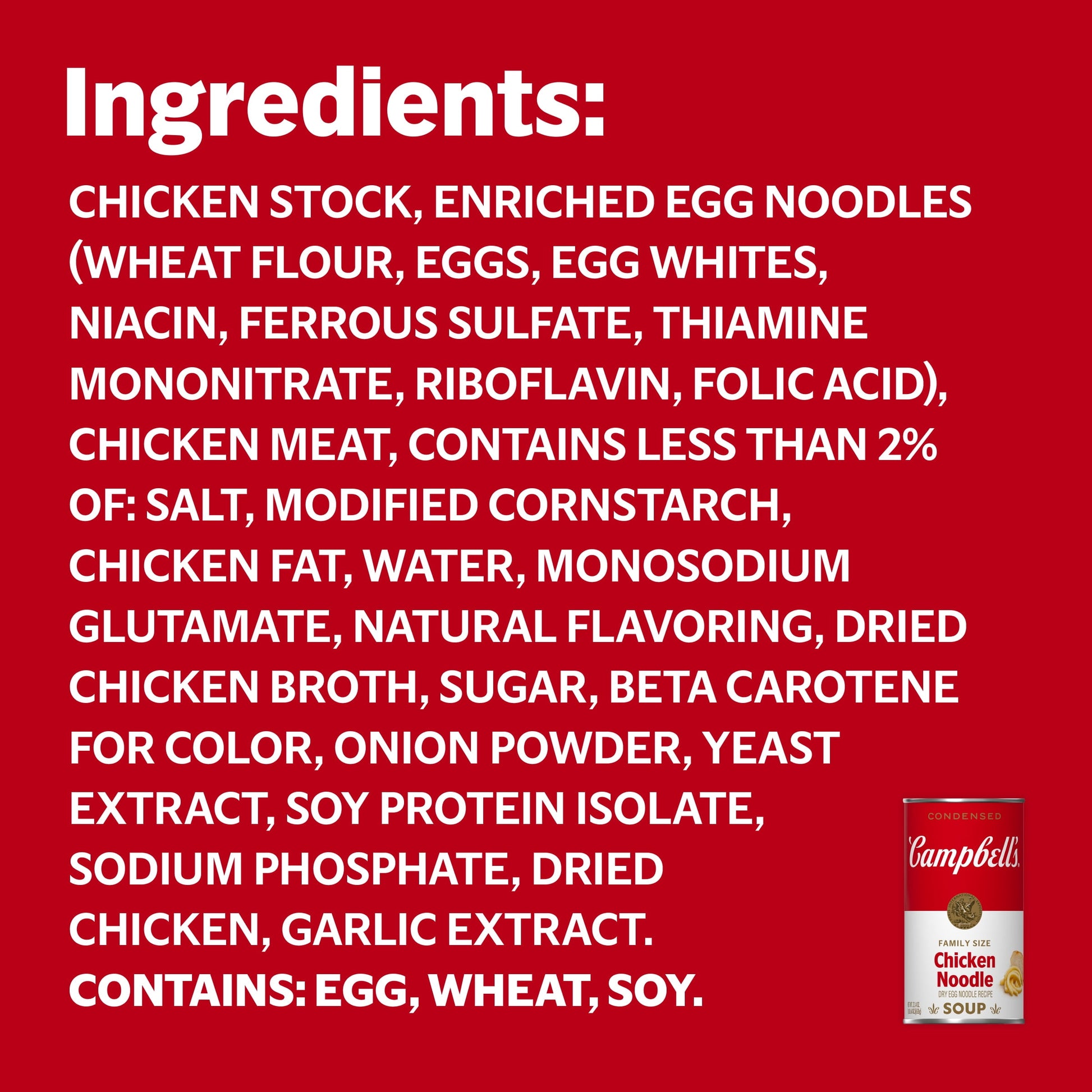 Campbell's Condensed Chicken Noodle Soup is a family favorite. Customize with fresh herbs, or pair it with your favorites. We perfectly season our golden chicken broth, add egg noodles and tender chicken raised without antibiotics. The end result is a soul-warming chicken noodle soup that brings a smile with every spoonful. Made with high-quality ingredients, this canned soup is a perfect addition to your weeknight family dinner. This trusted staple is the start to a great meal. M’m! M’m! Good! This product is packaged in a metal can, and is shelf-stable/ambient.