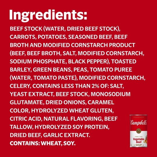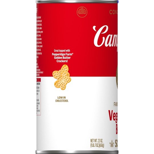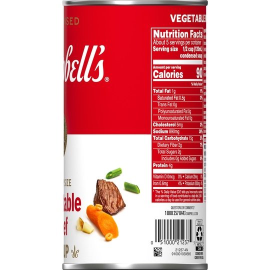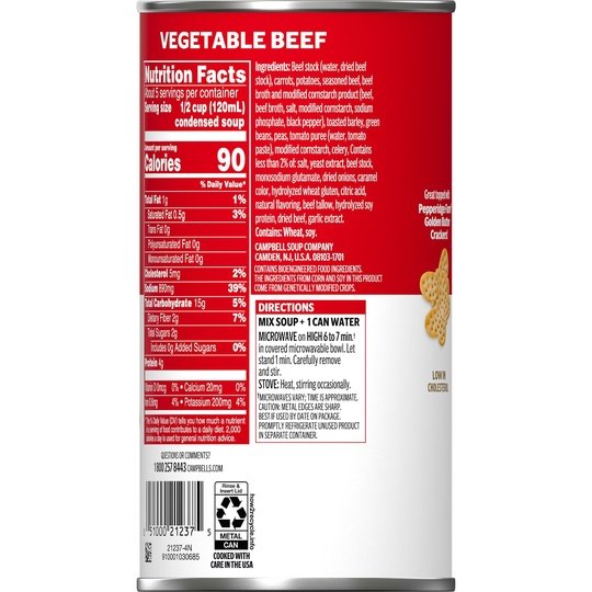 Campbell’s Condensed Vegetable Beef Soup is a family favorite. Customize with fresh avocado, or pair it with your favorites. This Vegetable Beef Soup starts with a hearty combination of carrots, potatoes, seasoned beef, barley, green beans, and peas. The end result is a soul-warming vegetable beef soup that brings a smile with every spoonful. Campbell’s Condensed Vegetable Beef Soup warms you up while delivering feel good comfort. It’s the start to a great meal. M’m! M’m! Good! This product is packaged in a metal can, and is shelf-stable/ambient.